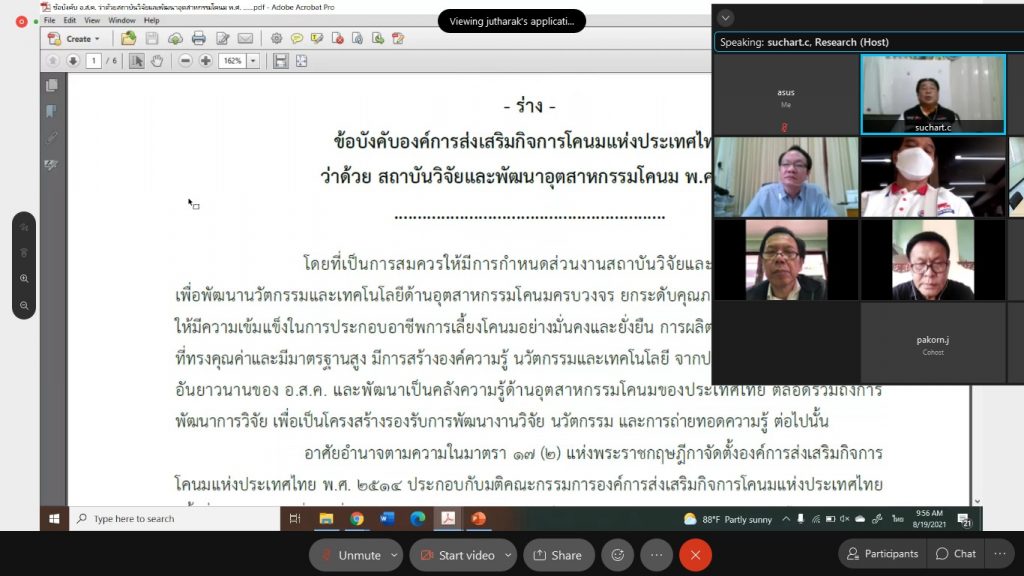 วันที่ 19 สิงหาคม 2564 นายสุชาติ จริยาเลิศศักดิ์ รองผู้อำนวยการ ทำการแทนผู้อำนวยการ อ.ส.ค.ได้ให้เกียรติเป็นประธานการประชุมคณะกรรมการขับเคลื่อนงานวิจัย พัฒนานวัตกรรมและเทคโนโลยีด้านอุตสาหกรรมโคนม (Dairy Academy) ครั้งที่ 3/2564 เพื่อติดตามผลการดำเนินงานตามมติที่ประชุมครั้งที่ผ่านมา โดยมีผู้บริหารและพนักงานที่เกี่ยวข้อง เข้าร่วมประชุมผ่านระบบ VDO Conference ทั้งนี้ผู้เข้าร่วมประชุมทุกท่านต้องปฏิบัติตามมาตรการป้องกันการแพร่ระบาดของโรคติดเชื้อโควิด-19 อย่างเคร่งครัด ณ ห้องประชุมฝ่ายวิจัยและพัฒนาการเลี้ยงโคนม สำนักงาน อ.ส.ค. มวกเหล็ก จ.สระบุรี