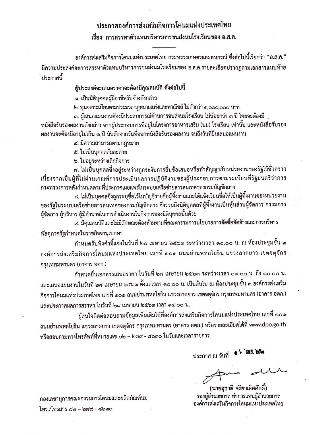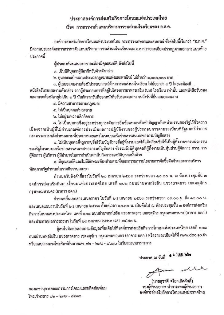 ประกาศการสรรหาตัวแทนบริหารการขนส่งนมโรงเรียนของ อ.ส.ค.