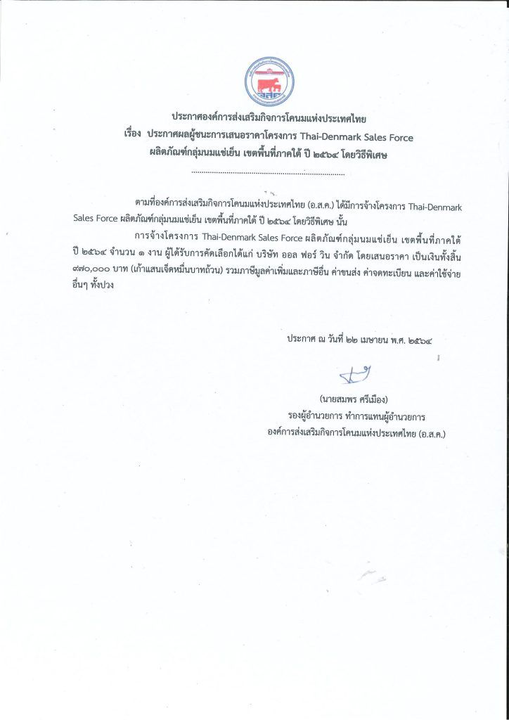 ประกาศผลผู้ชนะการเสนอโครงการ Thai-Denmark Sales Force ผลิตภัณฑ์กลุ่มนมแช่เย็น เขตพื้นที่ภาคใต้ ปี 2564