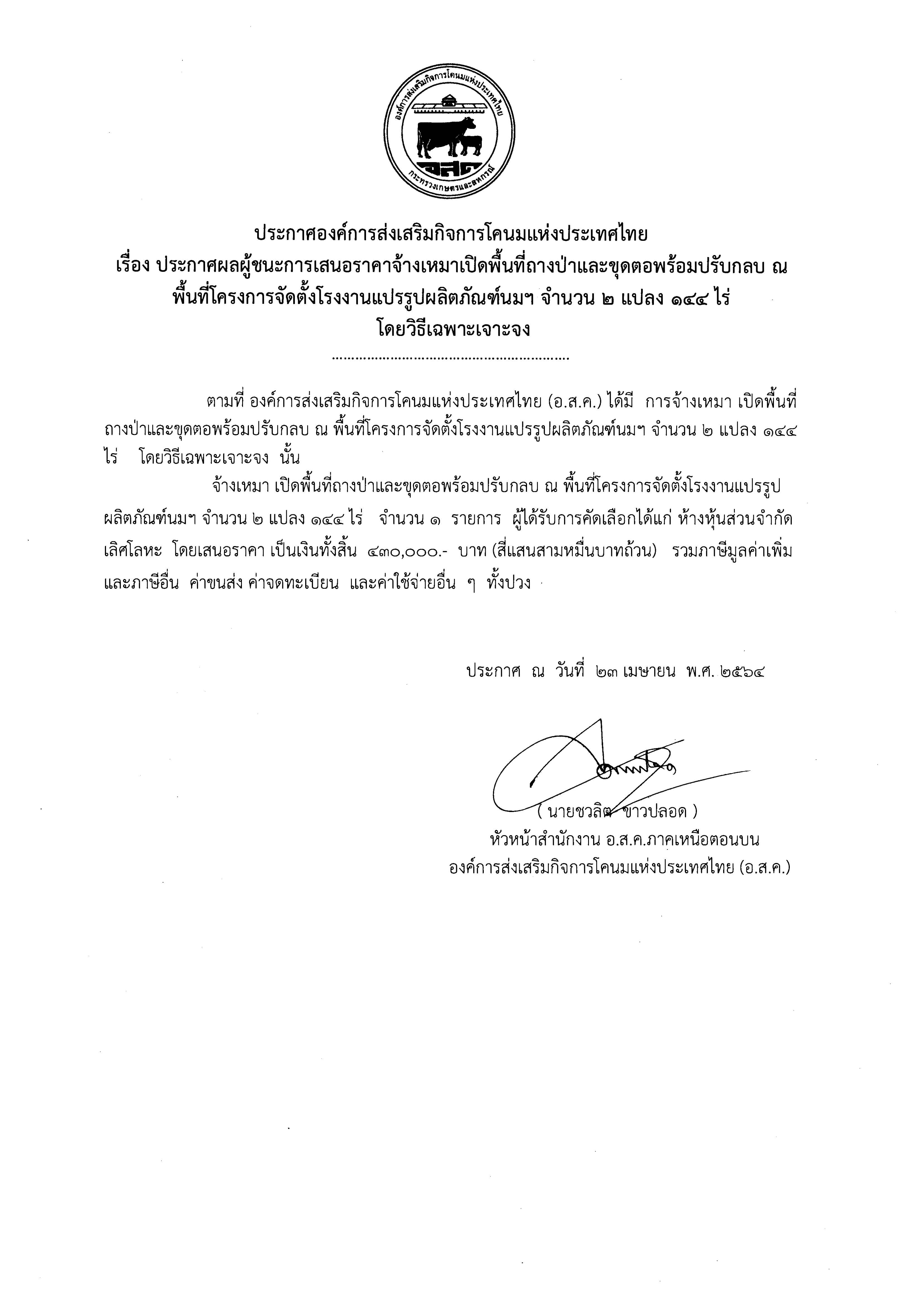 ประกาศผลผู้ชนะการเสนอราคาจ้างเหมาเปิดพื้นที่ถางป่าและขุดตอพร้อมปรับกลบ ณ พื้นที่โครงการจัดตั้งโรงงานแปรรูปผลิตภัณฑ์นม โดยวิธีเฉพาะเจาะจง