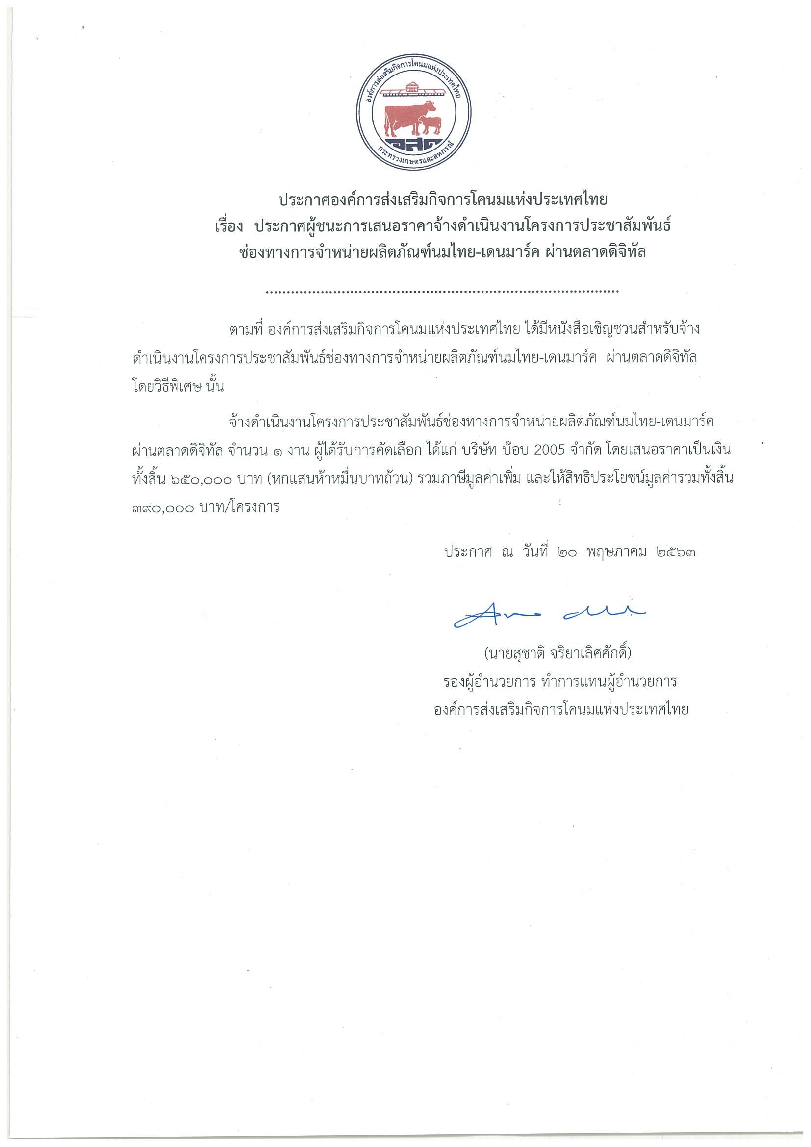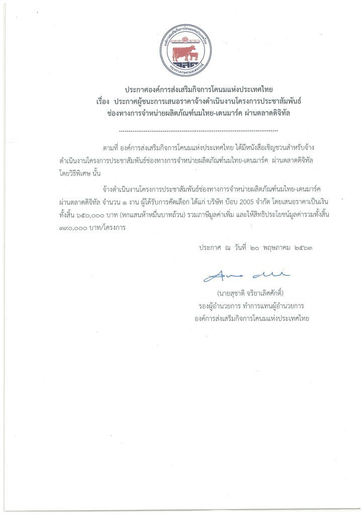 ประกาศผู้ชนะการเสนอราคาจ้างดำเนินงานโครงการประชาสัมพันธ์ช่องทางการจำหน่ายผลิตภัณฑ์นมไทย-เดนมาร์คผ่านตลาดดิจิทัล