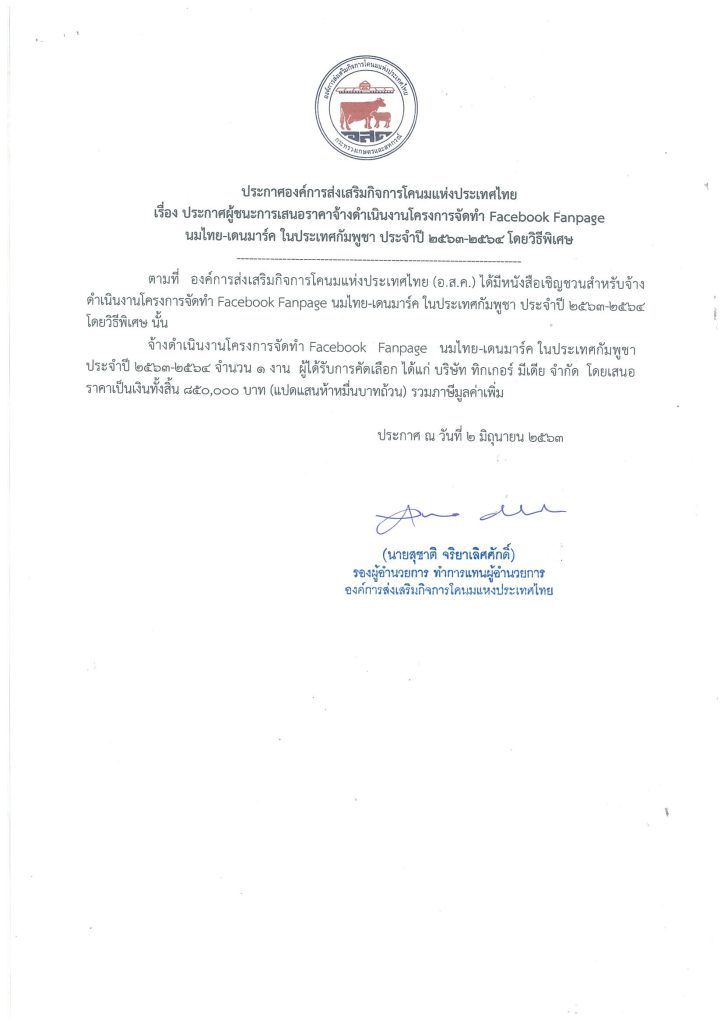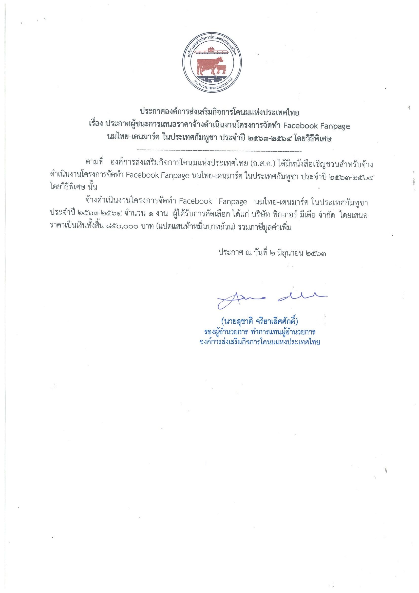 ประกาศผู้ชนะการเสนอราคาจ้างดำเนินงานโครงการจัดทำ Facebook Fanpage นมไทย-เดนมาร์ค ในประเทศกัมพูชา ประจำปี 2563-2564
