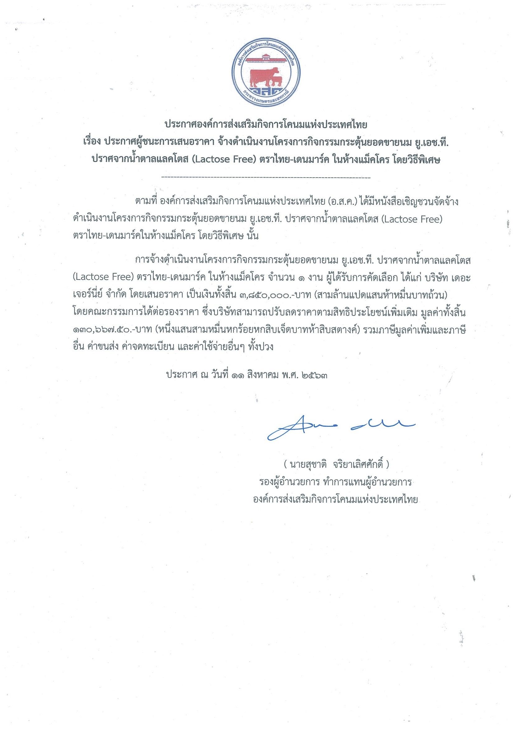 ประกาศผู้ชนะการเสนอราคาจ้างดำเนินโครงการกิจกรรมกระตุ้นยอดขายนม ยู.เอช.ที. ปราศจากน้ำตาลแลคโตส (Lactose Free) ตราไทย-เดนมาร์ค ในห้างแม็คโคร