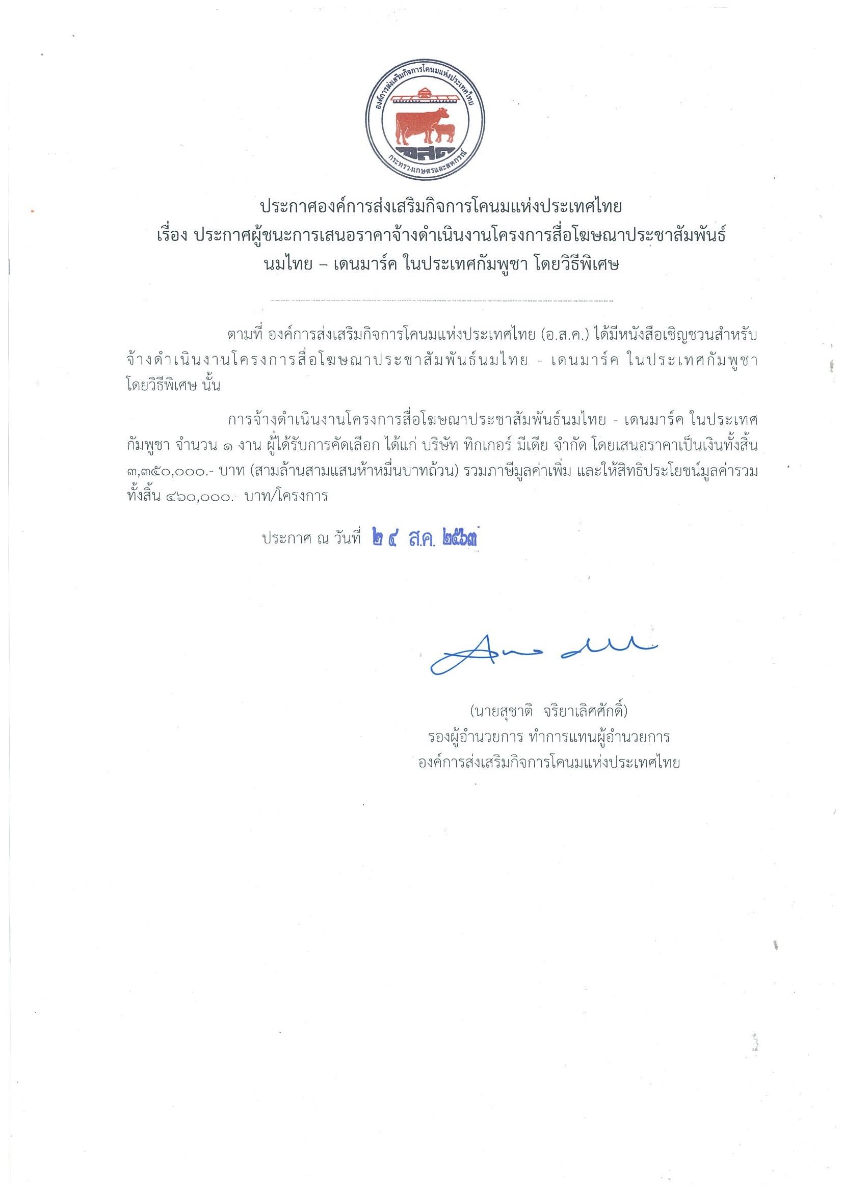 ประกาศผู้ชนะการเสนอราคาจ้างดำเนินงานโครงการสื่อโฆษณาประชาสัมพันธ์นมไทย-เดนมาร์ค ในประเทศกัมพูชา