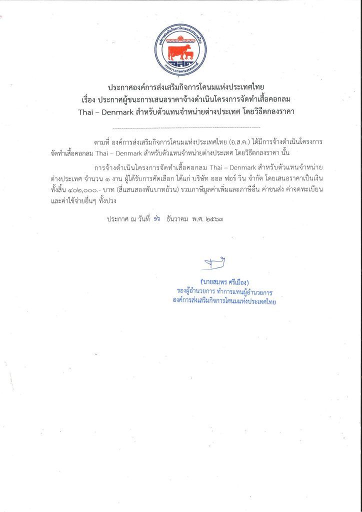 ประกาศผู้ชนะการเสนอราคาจ้างดำเนินโครงการจัดทำเสื้อคอกลม Thai-Denmark สำหรับตัวแทนจำหน่ายต่างประเทศ