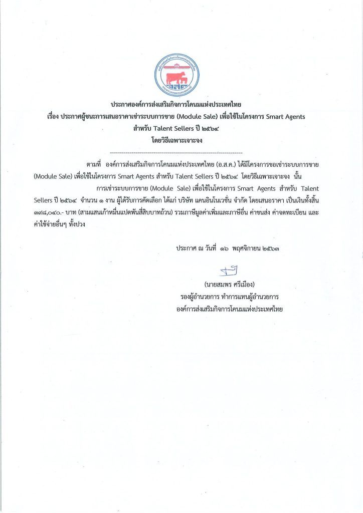 ประกาศผู้ชนะการเสนอราคาเช่าระบบการขาย (Module Sellers) เพื่อใช้ในโครงการ Smart Agents สำหรับ Talent Sellers ปี 2564