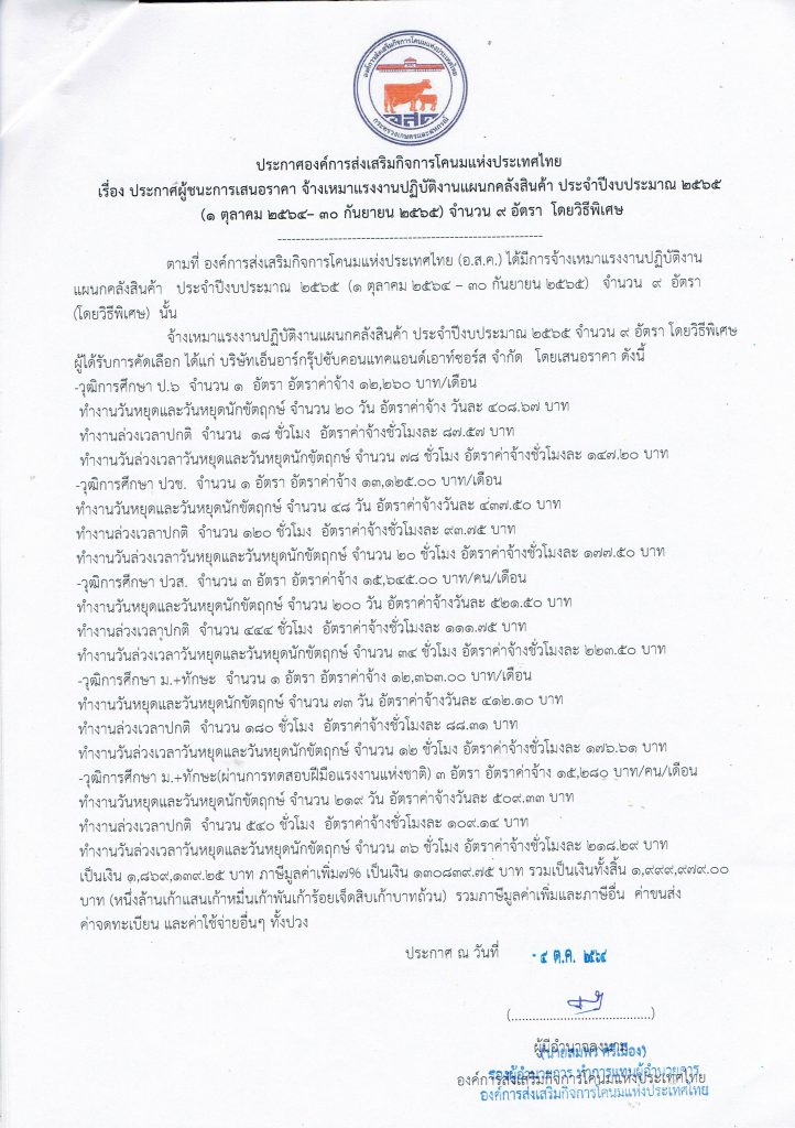 ประกาศผู้ชนะการเสนอราคาจ้างเหมาแรงงานปกิบัติงานแผนกคลังสินค้าประจำปีงบประมาณ 2565