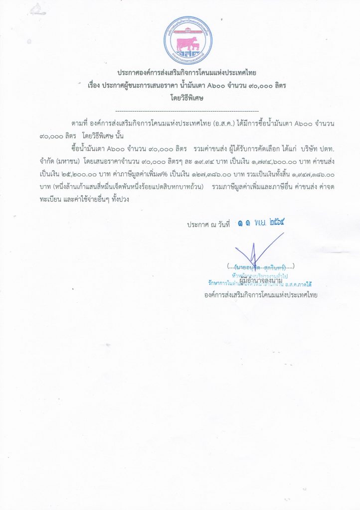 ประกาศผู้ชนะการเสนอราคา จัดซื้อน้ำมันเตา A600 จำนวน 90,000 ลิตร โดยวิธีพิเศษ