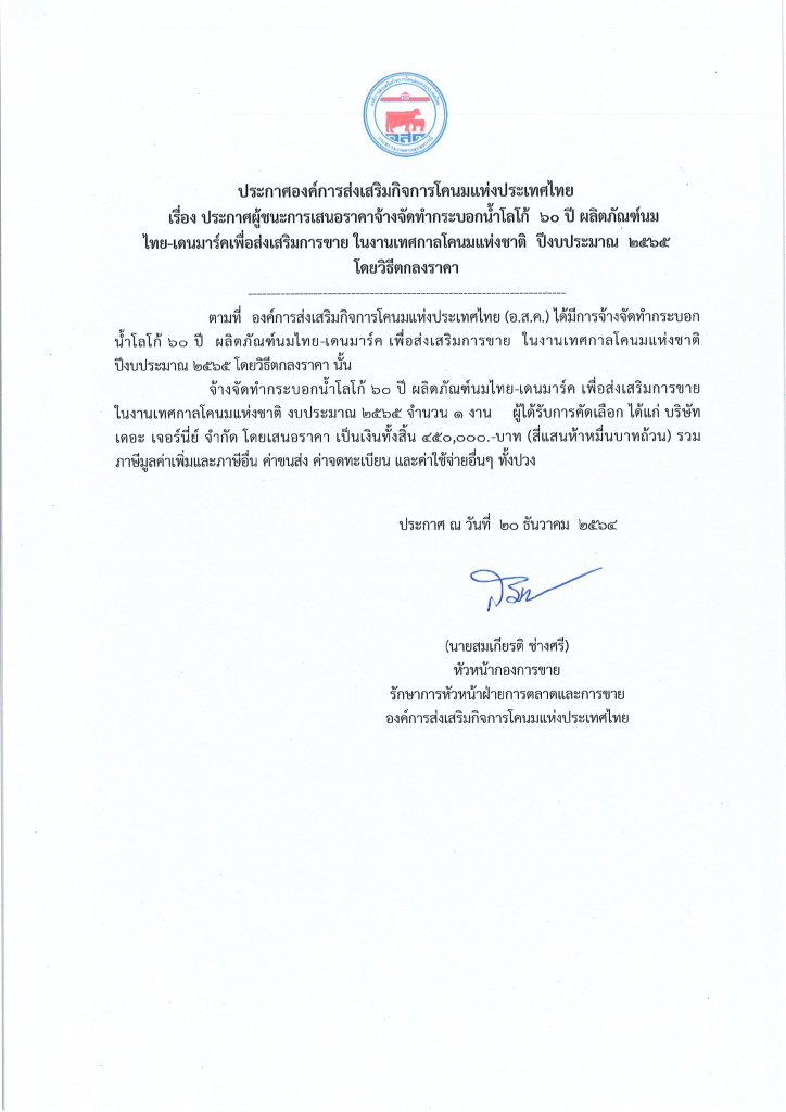ประกาศผู้ชนะการเสนอราคาจ้างจัดทำกระบอกน้ำโลโก้ 60 ปี ผลิตภัณฑ์นมไทย-เดนมาร์คเพื่อส่งเสริมการขาย ในงานเทศกาลโคนมแห่งชาติ ปีงบประมาณ 2565 โดยวิธีตกลงราคา