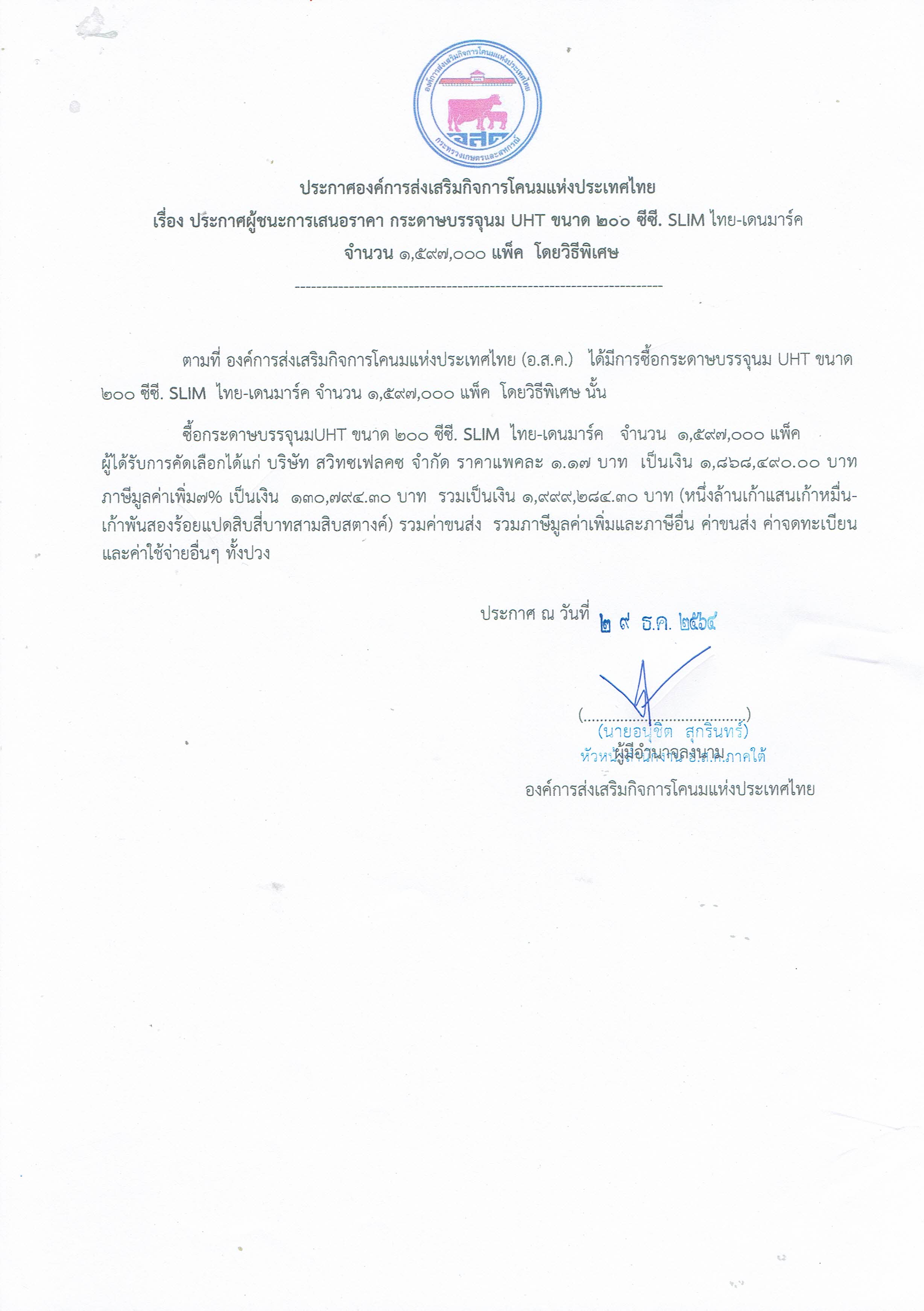 ประกาศผู้ชนะการเสนอราคากระดาษบรรจุนม UHT ขนาด 200 ซีซี SLIM ไทย-เดนมาร์ค จำนวน 1,597,000 แพ็ค โดยวิธีพิเศษ