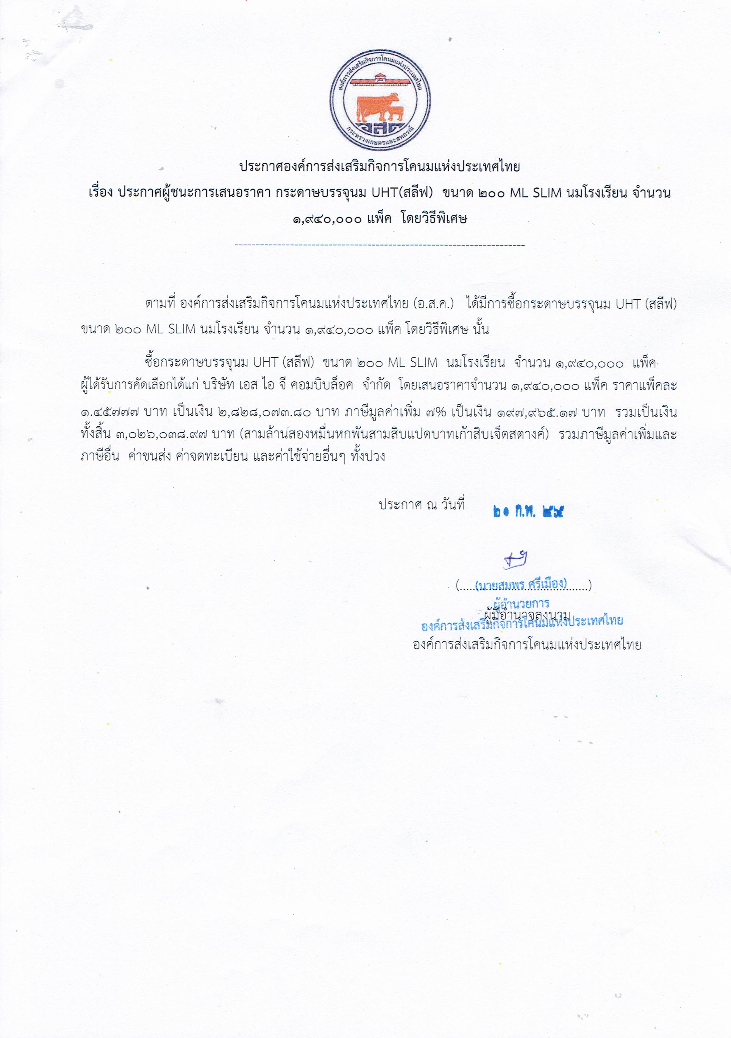 ประกาศผู้ชนะการเสนอราคากระดาษบรรจุนมUHT(สลีฟ) ขนาด 200 มล. Slim นมโรงเรียน จำนวน 1,940,000 แพ็ค โดยวิธีพิเศษ