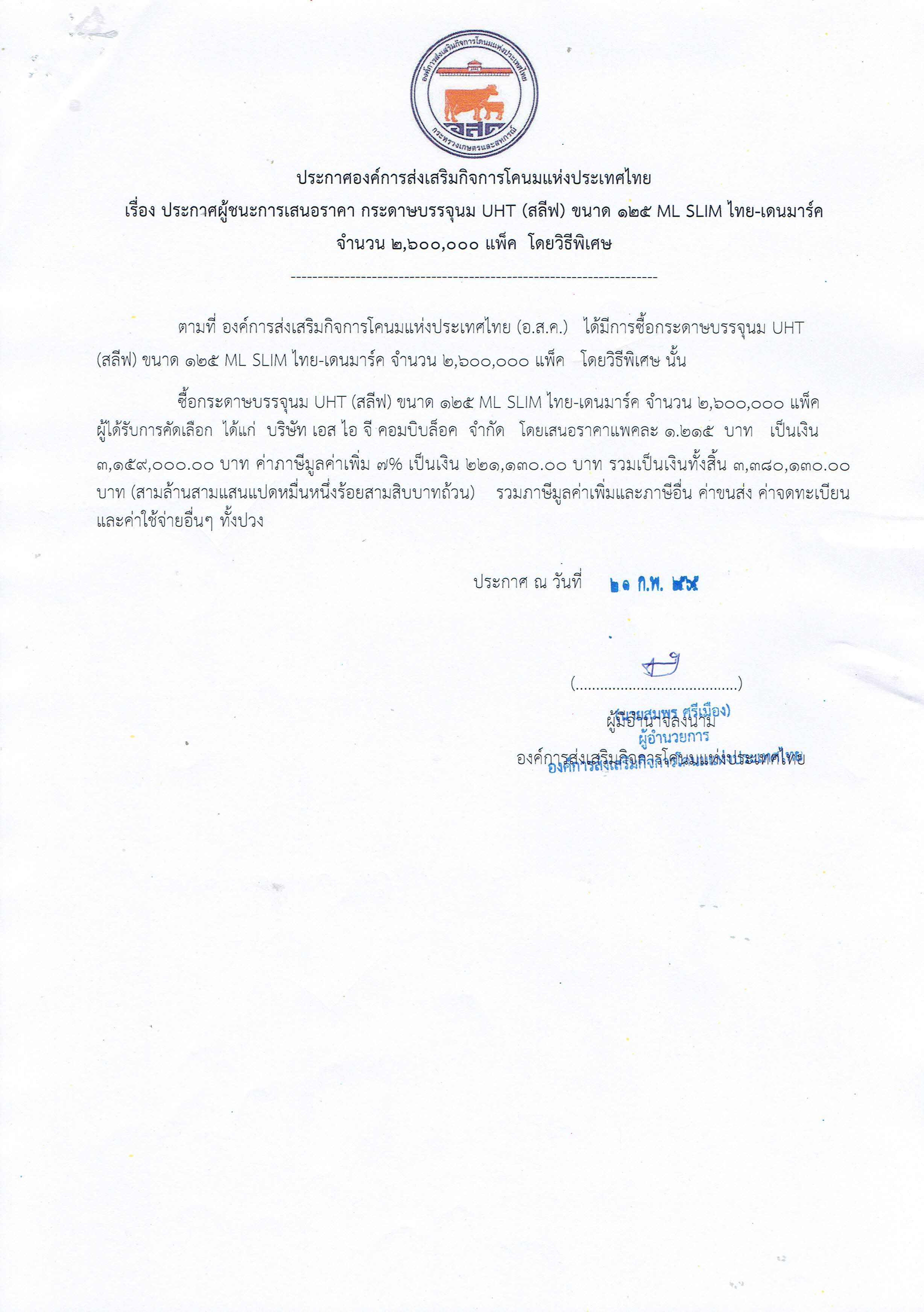 ประกาศผู้ชนะการเสนอราคาซื้อกระดาษบรรจุนมUHT(สลีฟ) ขนาด 125 มล. Slim นมโรงเรียน จำนวน 2,600,000 แพ็ค โดยวิธีพิเศษ