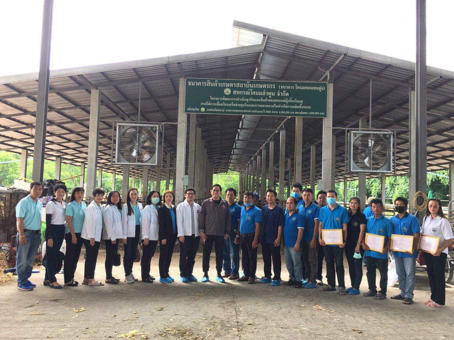 ช่วงเช้าวันที่ 12 สิงหาคม 2563 นายวิทวัส ชัยปาณี กรรมการผู้ทรงคุณวุฒิ อ.ส.ค. ให้เกียรติเป็นประธานในพิธีมอบใบประกาศนียบัตรให้แก่เกษตรกรที่ได้รับคัดเลือกเป็นฟาร์มโคนมพี่เลี้ยงและผ่านการฝึกอบรม โครงการ “อ.ส.ค. รักนม รักฟาร์ม ยกระดับเป็นฟาร์มโคนมพี่เลี้ยง” เพื่อส่งเสริมยกระดับระบบการจัดการเลี้ยงโคนมและสร้างเครือข่ายกับฟาร์มเกษตรกร พร้อมด้วยคณะอนุกรรมการ CG/CSR ผู้บริหารและพนักงานสำนักงาน อ.ส.ค. ภาคเหนือตอนบน เข้าร่วมพิธีในครั้งนี้ด้วย ต่อจากนั้นได้เข้าเยี่ยมชมกิจการของสหกรณ์โคนมลำพูน ธนาคารโคนมทดแทนฝูง โดยมี นายชญานนท์ ญาติมาก ประธานสหกรณ์โคนมลำพูน ให้การต้อนรับ ณ สหกรณ์โคนมลำพูน อ.บ้านธิ จ.ลำพูน และช่วงบ่ายเข้าเยี่ยมชมสหกรณ์โคนมแม่ออน และกระบวนการทำอาหาร TMR โดยมีนายจำลอง ไชยวรรณาประธานสหกรณ์โคนมแม่ออน ให้การต้อนรับ ณ สหกรณ์โคนมแม่ออน อ.แม่ออน จ.เชียงใหม่