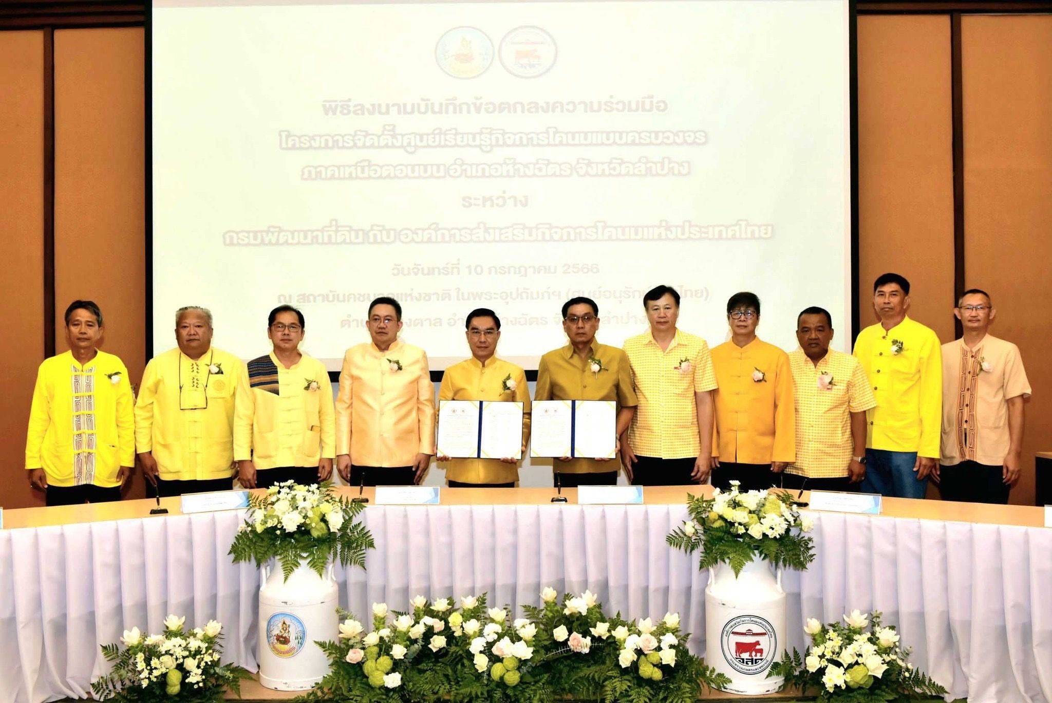 วันที่ 10 กรกฎาคม 2566 นายสมพร ศรีเมือง ผู้อำนวยการ อ.ส.ค. มอบหมายให้นายชัยณรงค์ เปาอินทร์ รองผู้อำนวยการ อ.ส.ค. เข้าร่วมลงนามบันทึกข้อตกลงความร่วมมือ (MOU) กับนายอาทิตย์ ศุขเกษม รองอธิบดีกรมพัฒนาที่ดินด้านวิชาการ  ในการสนับสนุนโครงการจัดตั้งศูนย์เรียนรู้กิจการโคนมแบบครบวงจร ภาคเหนือตอนบน อ.ห้างฉัตร จ.ลำปาง ระหว่างกรมพัฒนาที่ดิน (พด.) กับองค์การส่งเสริมกิจการโคนมแห่งประเทศไทย (อ.ส.ค.) เพื่อจัดตั้งศูนย์เรียนรู้กิจการโคนมแบบครบวงจร ภาคเหนือตอนบน โดยใช้ประโยชน์ในพื้นที่สถานีพัฒนาที่ดินลำปาง และร่วมมือดำเนินกิจกรรมต่างๆ อาทิ เป็นศูนย์เรียนรู้จัดทำแหล่งสนับสนุนอาหารโคนมต้นทุนต่ำ ศูนย์เลี้ยงโคนมทดแทนแบ่งเบาภาระเกษตรกรผู้เลี้ยงโคนม และเป็นแหล่งเรียนรู้ดูงานกิจการโคนมนานาชาติ โดยมีผู้บริหาร อ.ส.ค. ผู้บริหารของกรมพัฒนาที่ดินและหัวหน้าส่วนราชการในพื้นที่ร่วมเป็นสักขีพยาน ณ ห้องประชุมกุญชรศุภศรี สถาบันคชบาลแห่งชาติ ในพระอุปถัมภ์ฯ (ศูนย์อนุรักษ์ช้างไทย) อ.ห้างฉัตร จ.ลำปาง