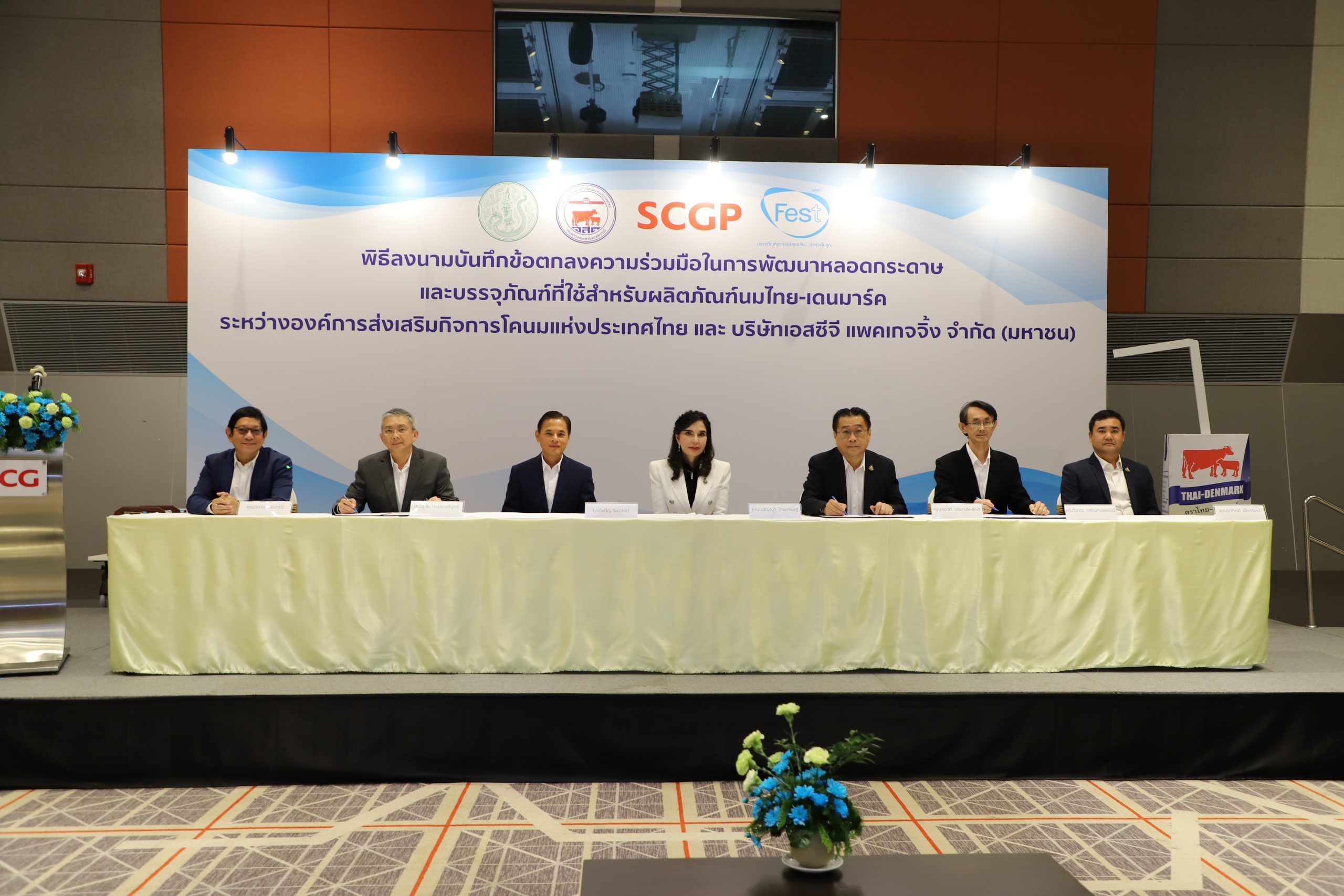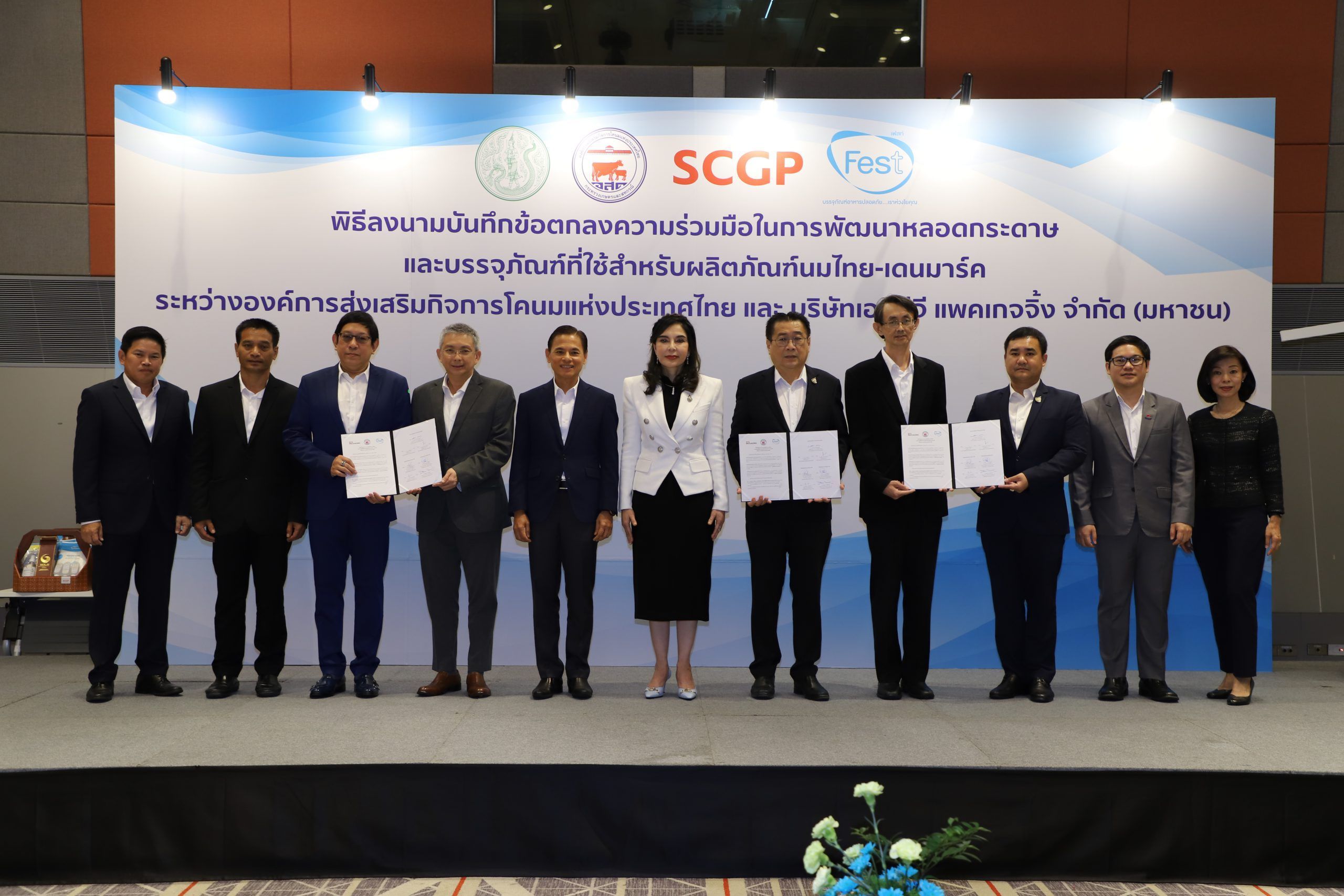 เช้าวันที่ 6 พฤศจิกายน 2563 นางสาวมนัญญา ไทยเศรษฐ์ รัฐมนตรีช่วยว่าการกระทรวงเกษตรและสหกรณ์ ให้เกียรติเป็นประธานในพิธีลงนามบันทึกข้อตกลงความร่วมมือ (MOU) ด้านการวิจัยและพัฒนาบรรจุภัณฑ์ที่ใช้สำหรับนมไทย-เดนมาร์ค ระหว่าง นายสุชาติ จริยาเลิศศักดิ์ รองผู้อำนวยการทำการแทนผู้อำนวยการองค์การส่งเสริมกิจการโคนมแห่งประเทศไทย (อ.ส.ค.) กับนายวิชาญ เจริญกิจสุพัฒน์ ประธานเจ้าหน้าที่ปฏิบัติการกิจการเยื่อและกระดาษ บริษัท ผลิตภัณฑ์กระดาษไทย จำกัด และ นายสุชัย กอประเสริฐศรี ประธานเจ้าหน้าที่ปฏิบัติการกิจการบรรจุภัณฑ์จากเยื่อและกระดาษ บริษัท กลุ่มสยามบรรจุภัณฑ์ จำกัด เพื่อพัฒนาการใช้หลอดกระดาษสำหรับบรรจุภัณฑ์ผลิตภัณฑ์นมไทย-เดนมาร์ค ให้มีประสิทธิภาพ สามารถลดการใช้พลาสติกในอุตสาหกรรมนม โดยมีดร. อาทิตย์ เพ็ชรรัตน์ กรรมการผู้ทรงคุณวุฒิ อ.ส.ค ,นายวิทวัส ชัยปานี ,นายธนพิพัฒน์ ธรรมรงสุธัญยุทธ์ อนุกรรมการ CG& CSR พร้อมด้วยผู้บริหาร และพนักงาน อ.ส.ค.เข้าร่วมงานในครั้งนี้ ณ ห้องประชุม Hall 1 อาคารเอนกประสงค์ ชั้น 10 บริษัท เอสซีจี แพคเกจจิ้ง จำกัด (มหาชน) ถนนปูนซีเมนต์ไทย บางซื่อ กรุงเทพฯ