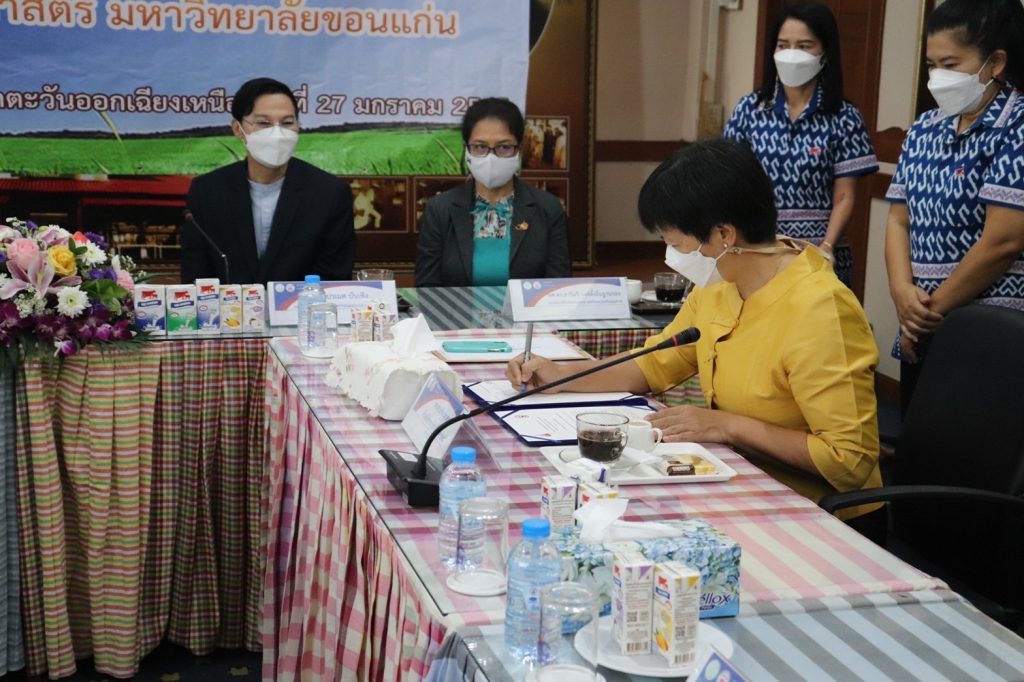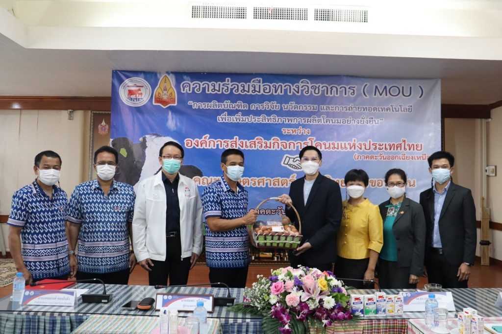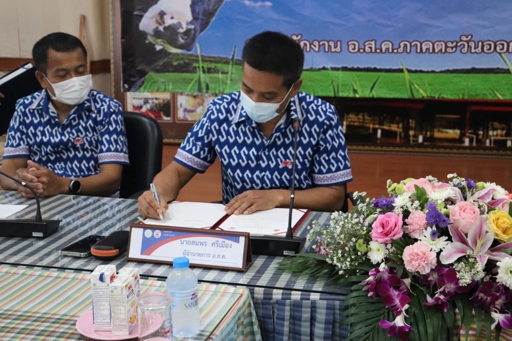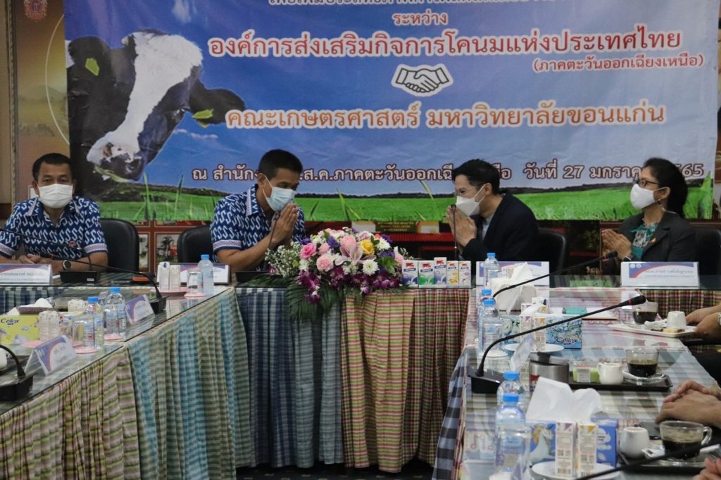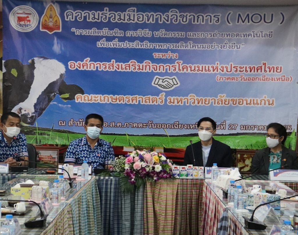 วันที่ 27 มกราคม 2565 นายสมพร ศรีเมือง ผู้อำนวยการ อ.ส.ค.ให้เกียรติร่วมพิธีลงนามบันทึกข้อตกลงความร่วมมือทางวิชาการ ร่วมกับรองศาสตราจารย์ ดร.ดรุณี โชติษฐยางกูร คณบดีคณะเกษตรศาสตร์ มหาวิทยาลัยขอนแก่น ภายใต้โครงการ”การผลิตบัณทิต การวิจัย นวัตกรรม และการถ่ายทอดเทคโนโลยี เพื่อเพิ่มประสิทธิภาพการผลิตโคนมอย่างยั่งยืน” เป็นโครงการความร่วมมือระหว่างองค์การส่งเสริมกิจการโคนมแห่งประเทศไทย (อ.ส.ค.) ร่วมกับคณะเกษตรศาสตร์มหาวิทยาลัยขอนแก่น มีวัตถุประสงค์เพื่อเพิ่มประสิทธิภาพการผลิตโคนมอย่างยั่งยืน ตลอดจนให้ความร่วมมือและสนับสนุนเพิ่มพูนความรู้แก่บุคลากรทั้งสองฝ่ายในรูปแบบการฝึกอบรม การถ่ายทอดเทคโนโลยีและองค์ความรู้ทางวิชาการ โดยทุกท่านได้ปฏิบัติตามมาตรการป้องกันการแพร่ระบาดของโรคติดเชื้อไวรัสโควิด-19 อย่างเคร่งครัด ณ ห้องประชุม สำนักงาน อ.ส.ค.ภาคตะวันออกเฉียงเหนือ อำเภอเมือง จังหวัดขอนแก่น