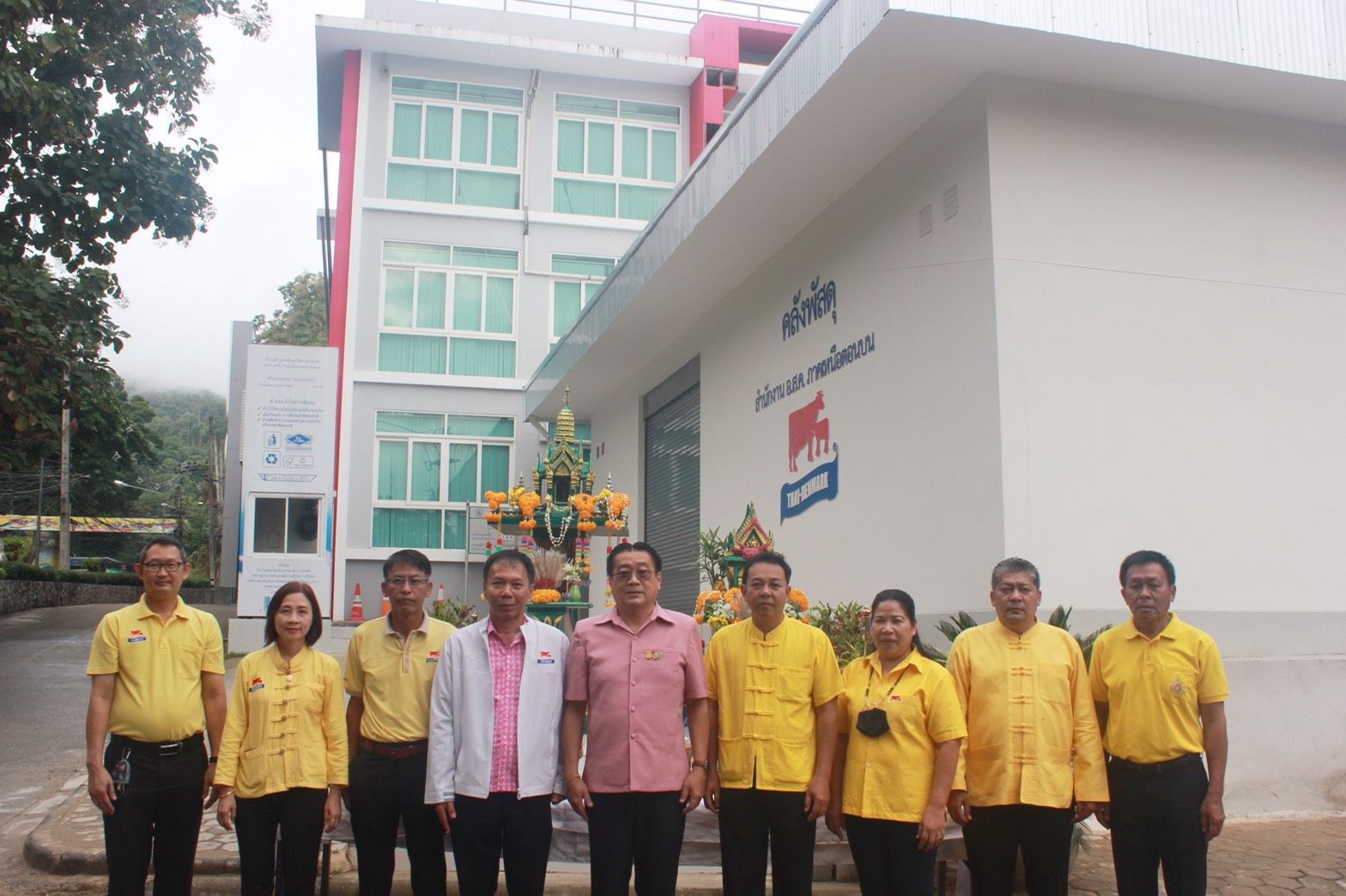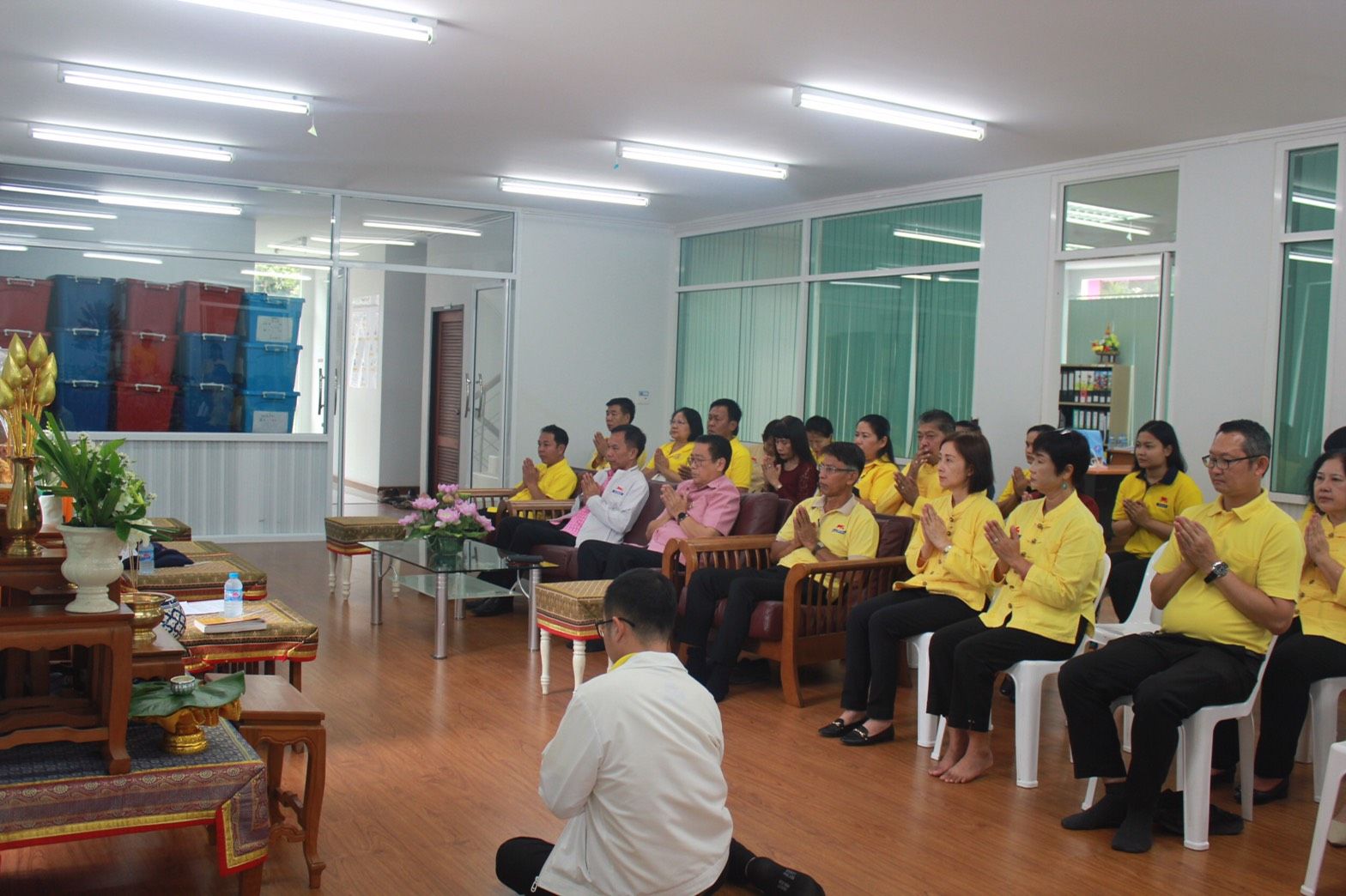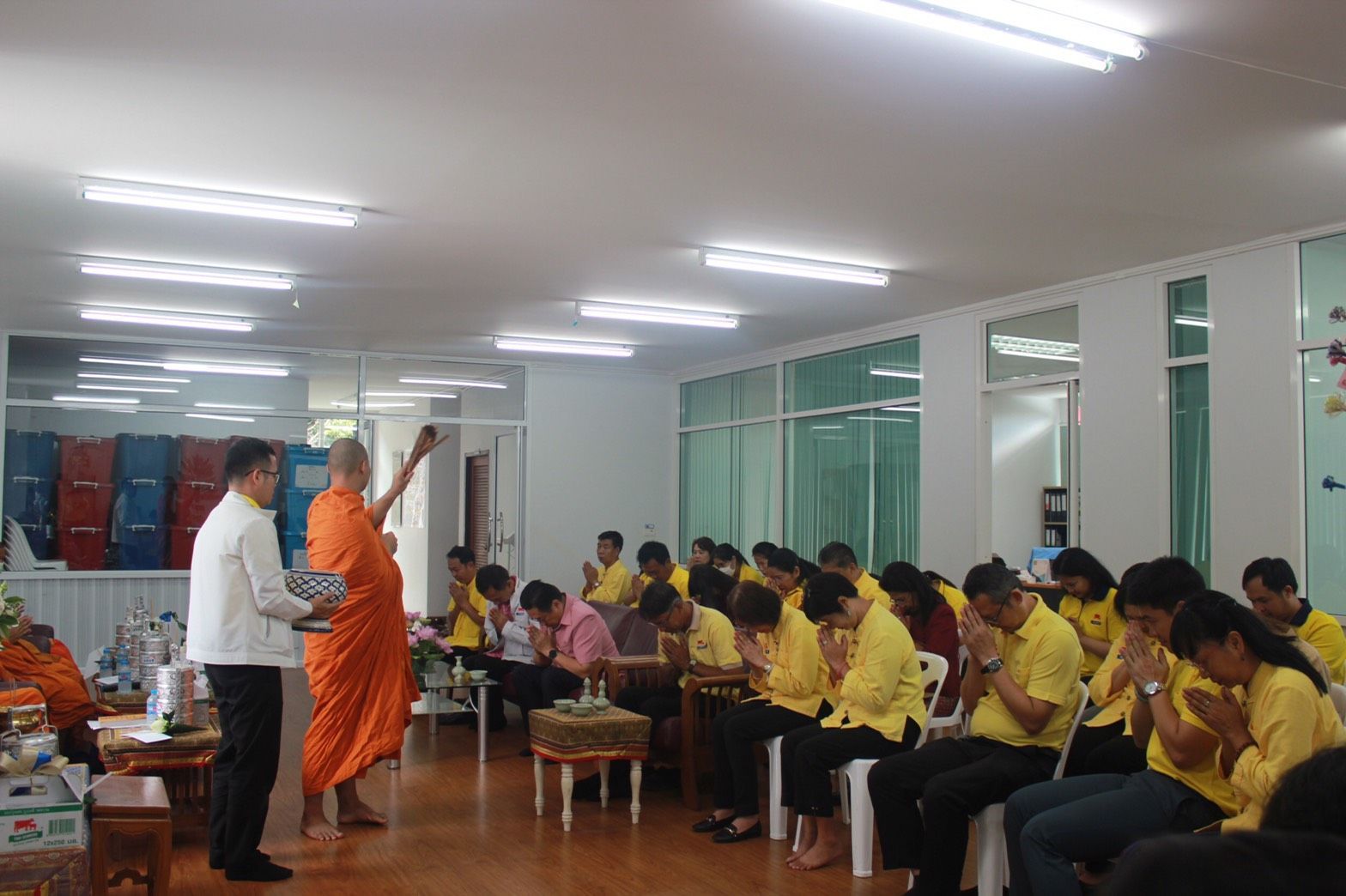 พิธีไหว้ศาลพระภูมิ ศาลเจ้าที่ สิ่งศักดิ์สิทธิ์ พิธีทำบุญสำนักงานและนิมนต์พระสงฆ์ทำพิธีเจิมอาคารคลังสินค้าหลังใหม่