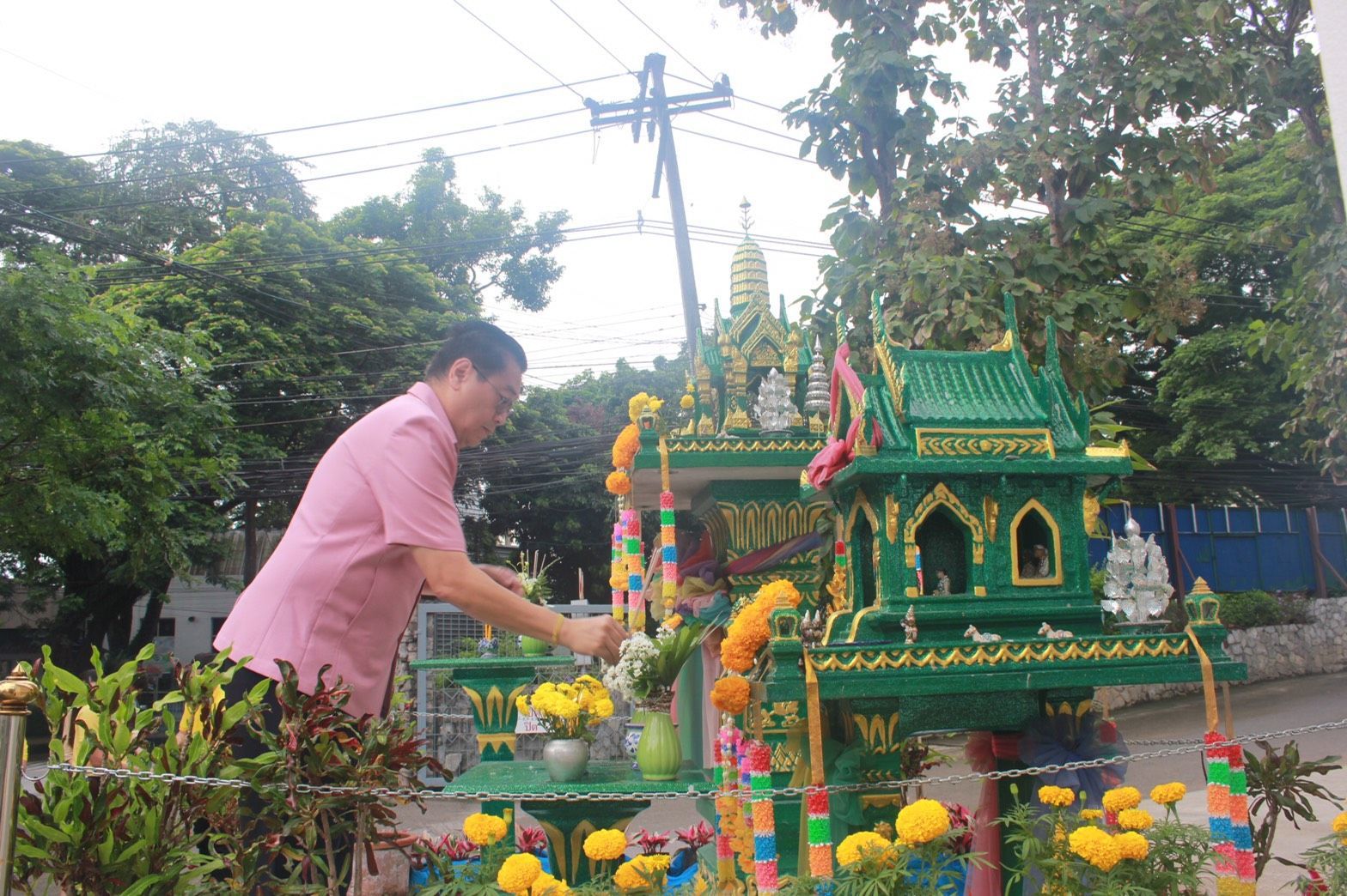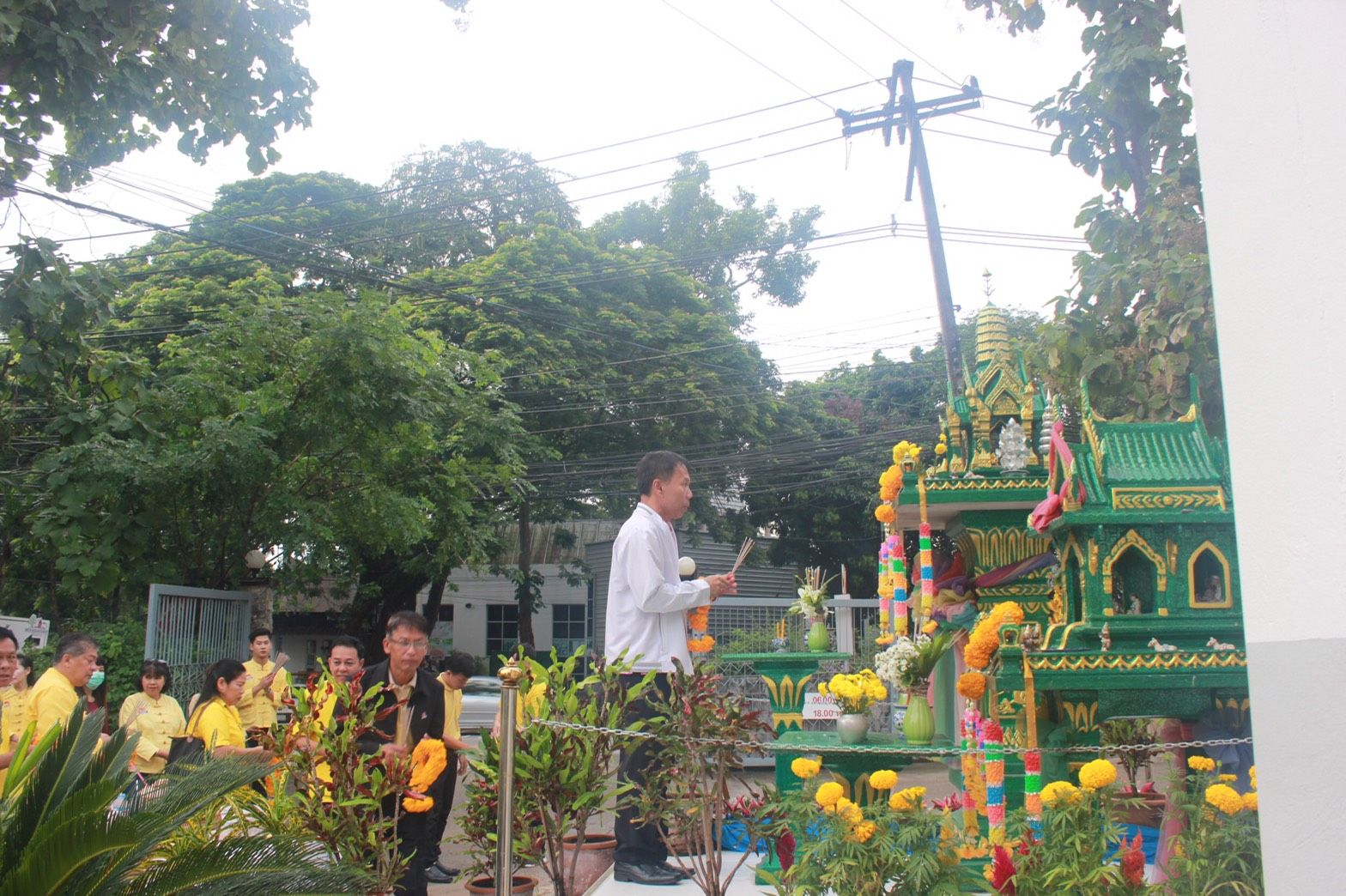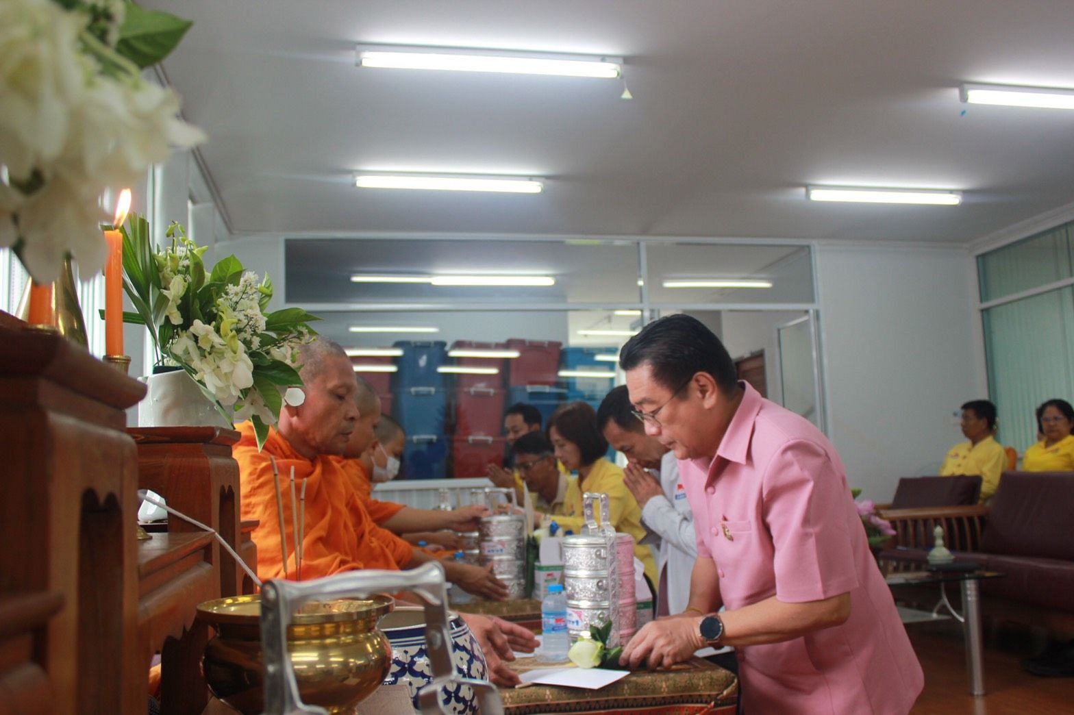 พิธีไหว้ศาลพระภูมิ ศาลเจ้าที่ สิ่งศักดิ์สิทธิ์ พิธีทำบุญสำนักงานและนิมนต์พระสงฆ์ทำพิธีเจิมอาคารคลังสินค้าหลังใหม่