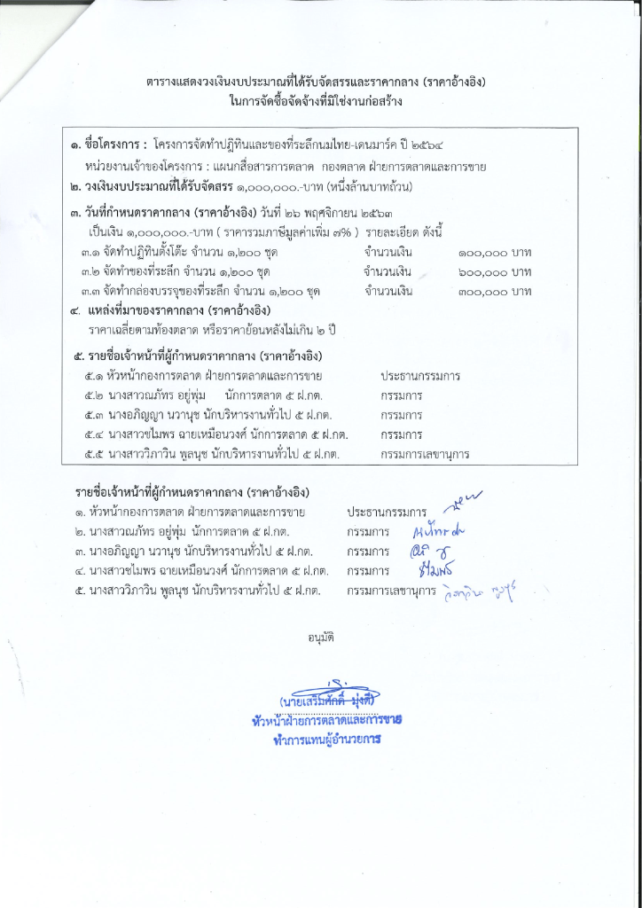ราคากลางโครงการจัดทำปฏิทินและของที่ระลึกนมไทย-เดนมาร์ค ปี 2564