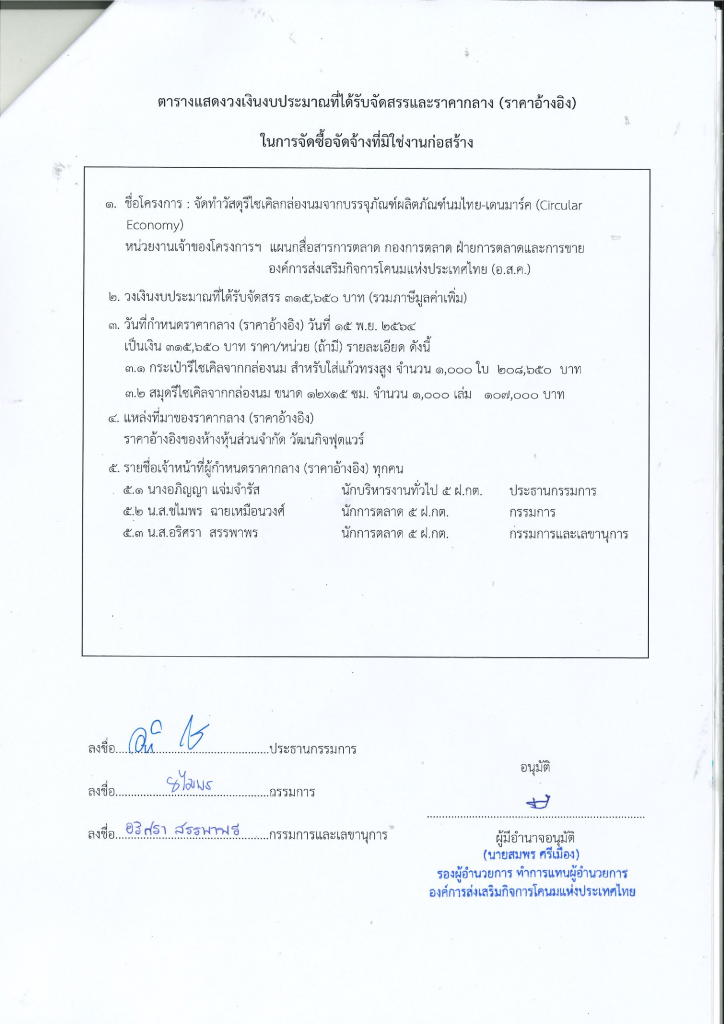 ราคากลางโครงการจัดทำวัสดุรีไซเคิลกล่องนมจากบรรจุภัณฑ์ผลิตภัณฑ์นมไทย-เดนมาร์ค (Circular Economy)