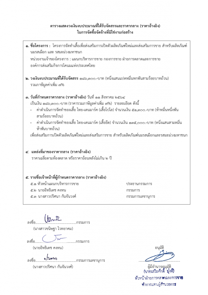 ราคากลางโครงการจัดทำเสื้อเพื่อส่งเสริมการเปิดตัวผลิตภัณฑ์ใหม่และส่งเสริมการขาย สำหรับผลิตภัณฑ์นมรสเผือกและรสมะม่วงมหาชนก