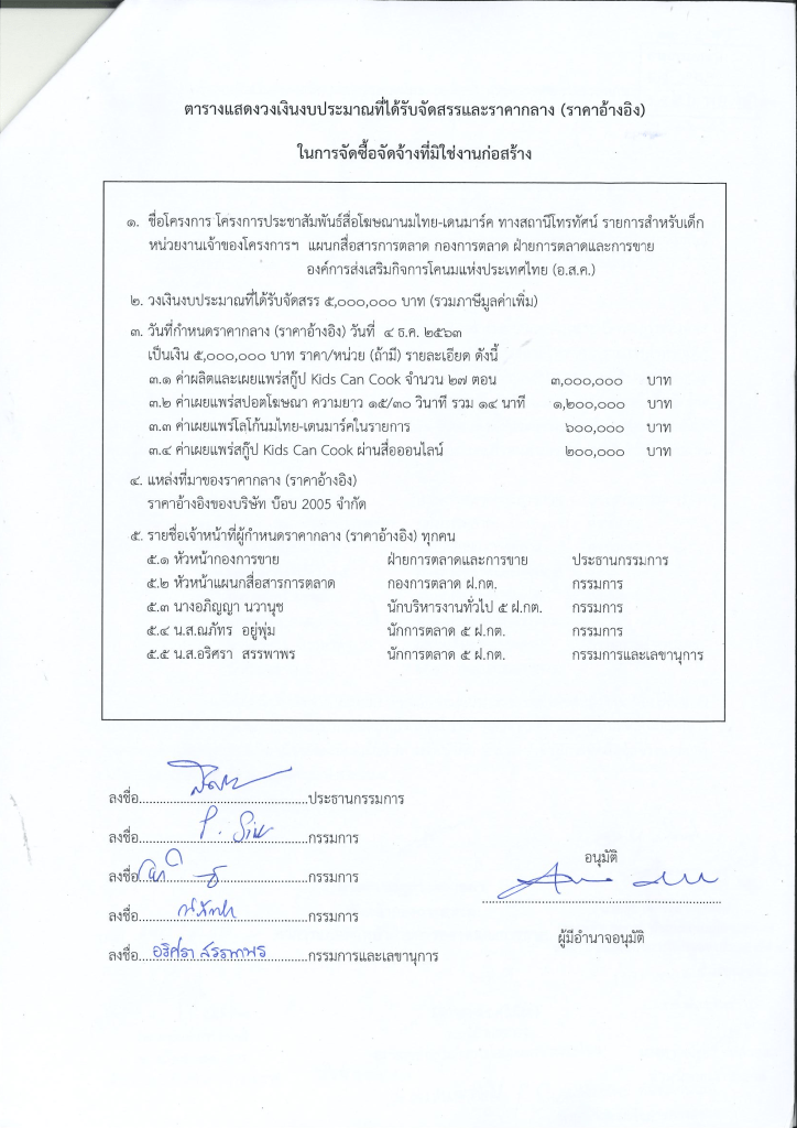 ราคากลางโครงการประชาสัมพันธ์สื่อโฆษณานมไทย-เดนมาร์ค ทางสถานีโทรทัศน์ รายการสำหรับเด็ก