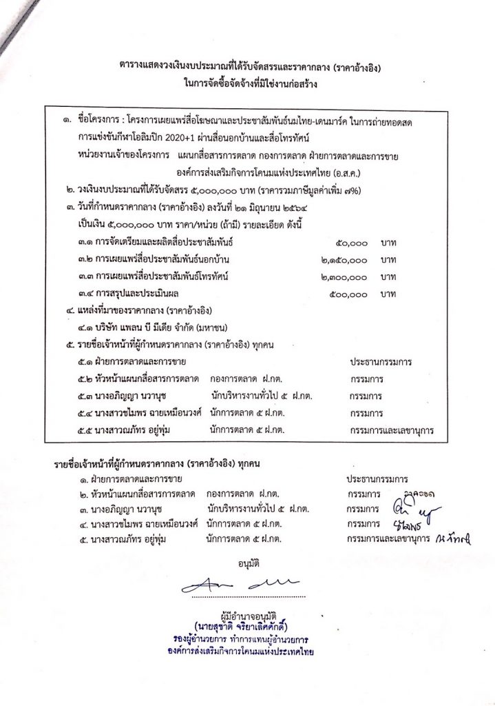 ราคากลางโครงการเผยแพร่สื่อโฆษณาและประชาสัมพันธ์นมไทย-เดนมาร์คในการถ่ายทอดสดการแข่งขันกีฬาโอลิมปิก 2020+1 ผ่านสื่อนอกบ้านและสื่อโทรทัศน์