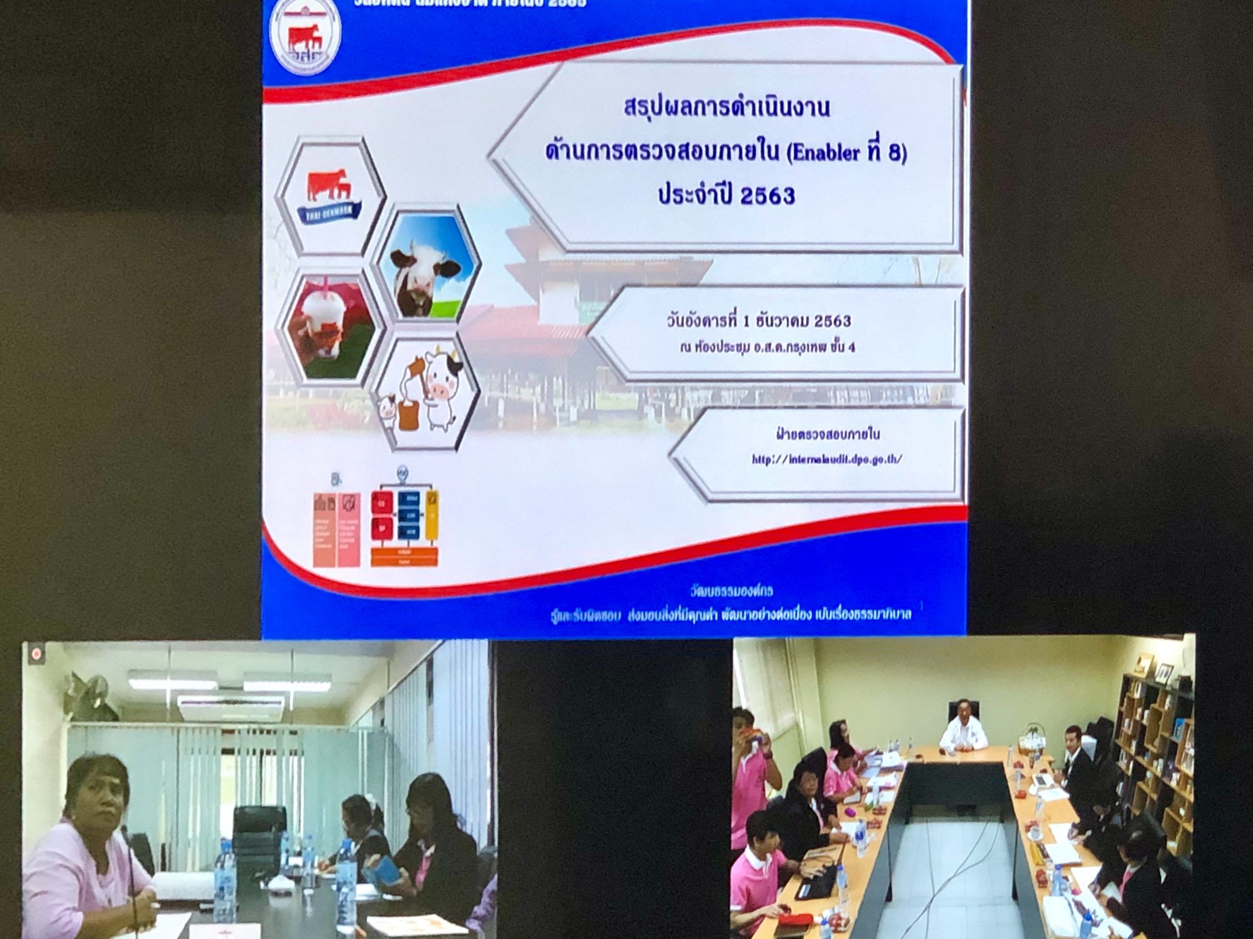 ช่วงเช้าวันที่ 1 ธันวาคม 2563 นายสุชาติ จริยาเลิศศักดิ์ รองผู้อำนวยการ ทำการแทนผู้อำนวยการ อ.ส.ค. พร้อมด้วยผู้บริหารและพนักงานที่เกี่ยวข้องของฝ่ายตรวจสอบภายใน เข้ารับการด้านตรวจสอบภายใน ณ ห้องประชุม ชั้น 4 สำนักงาน อ.ส.ค. กรุงเทพฯ ผ่าน Video Conference กับ ห้องประชุม 2 สำนักงาน อ.ส.ค. มวกเหล็ก จังหวัดสระบุรี