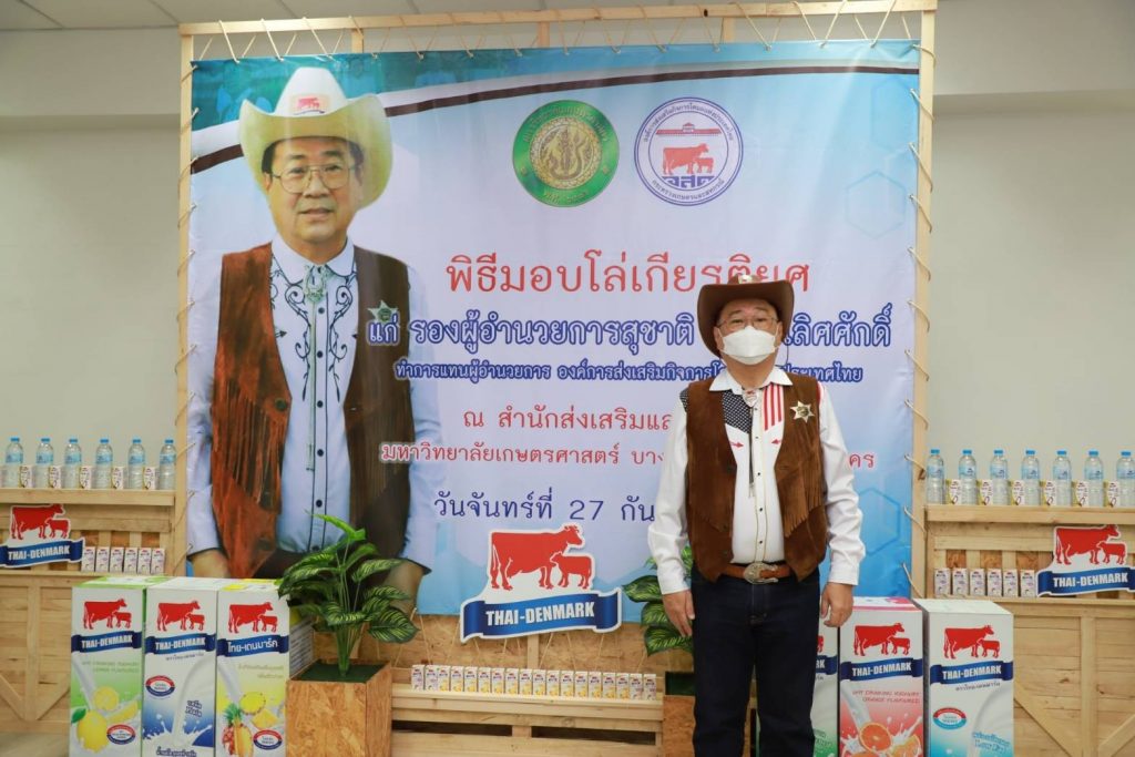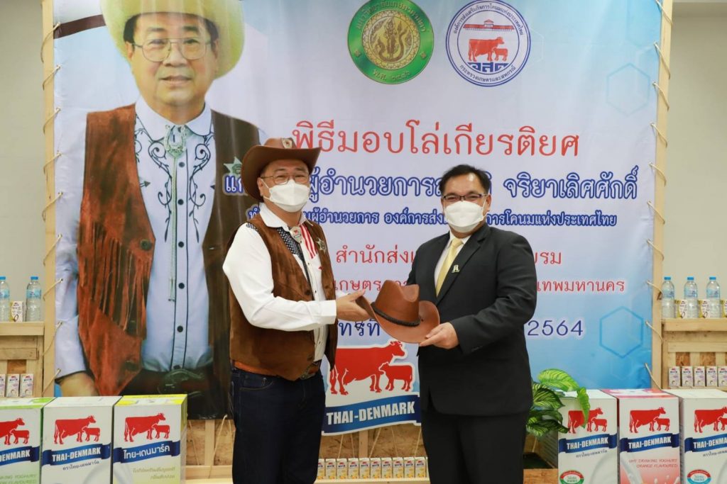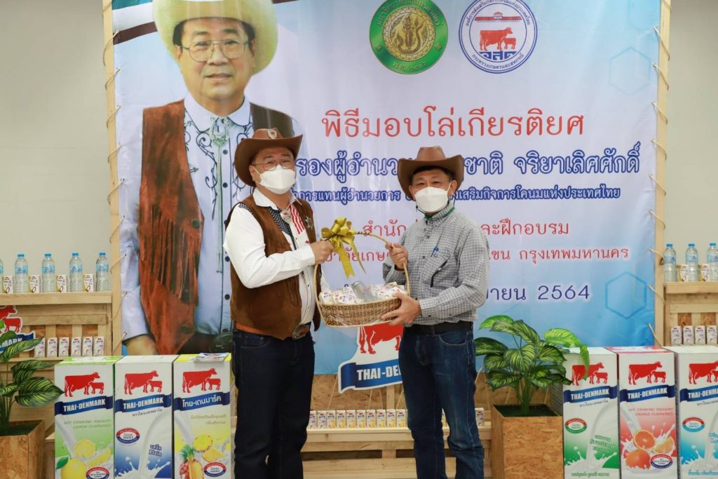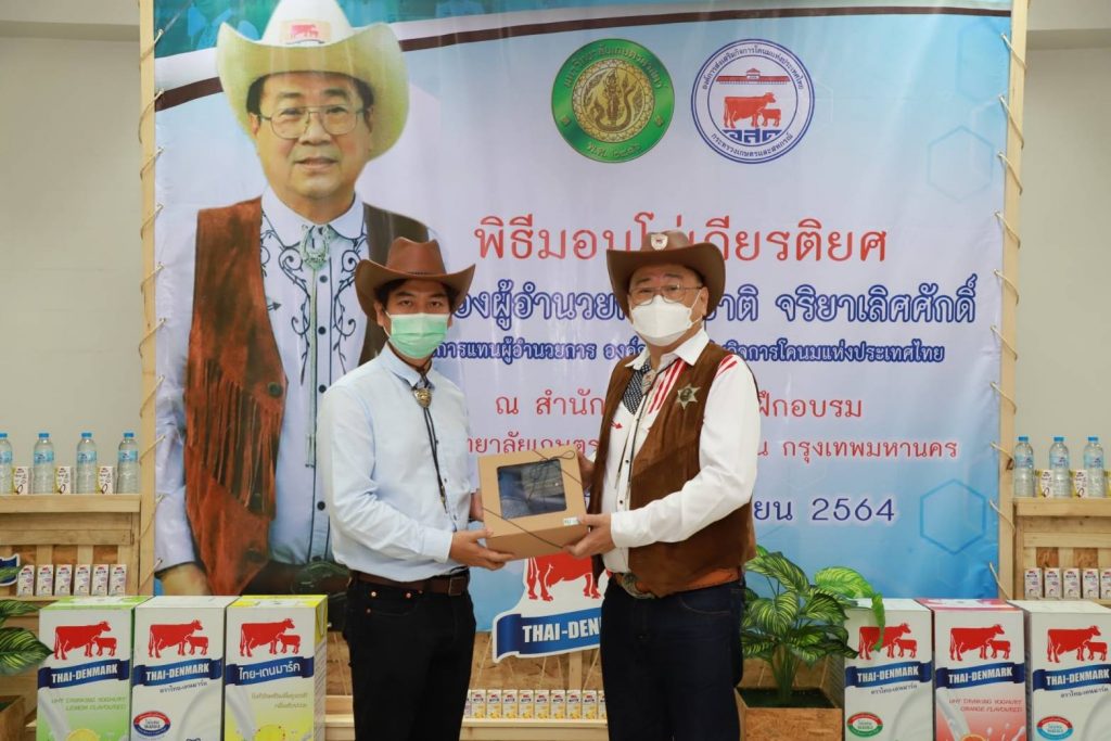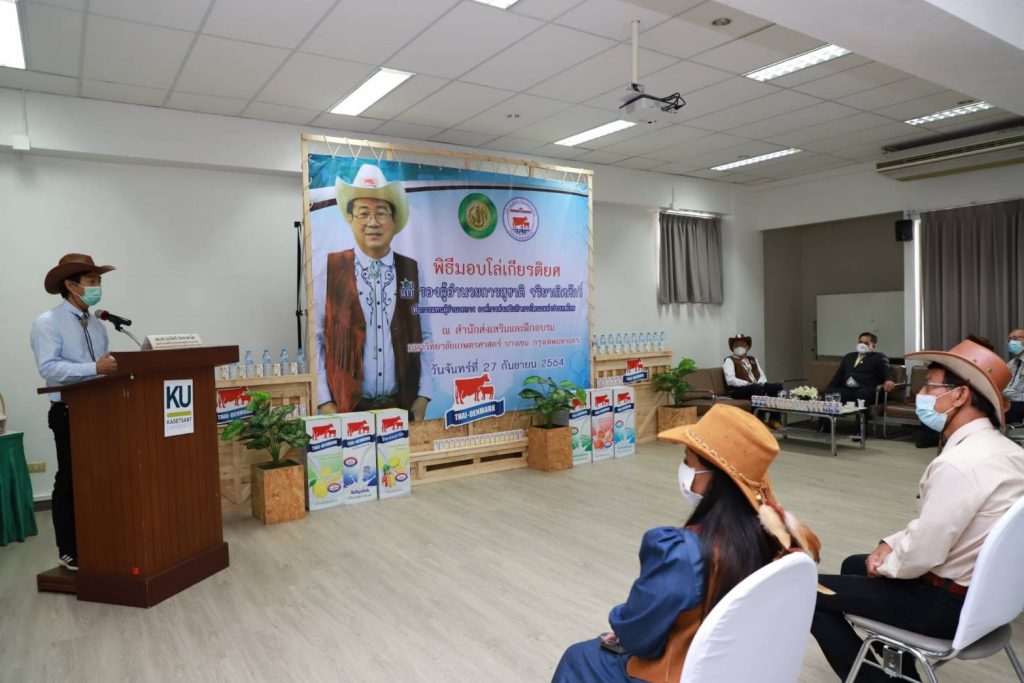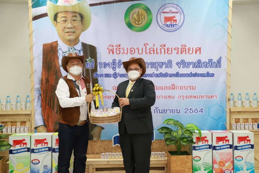 วันที่ 27 กันยายน 2564 นายสุชาติ จริยาเลิศศักดิ์ รองผู้อำนวยการ ทำการแทนผู้อำนวยการองค์การส่งเสริมกิจการโคนมแห่งประเทศไทย (อ.ส.ค.) เข้ารับมอบโล่เกียรติยศ จาก ดร.จงรัก วัชรินทร์รัตน์ อธิการบดีมหาวิทยาลัยเกษตรศาสตร์ ภายใต้ข้อตกลงความร่วมมือทางวิชาการระหว่างมหาวิทยาลัยเกษตรศาสตร์ กับองค์การส่งเสริมกิจการโคนมแห่งประเทศไทย (อ.ส.ค.) ซึ่งได้สร้างสรรค์ผลงานให้เกิดคุณูปการต่อการเลี้ยงโคนมของประเทศไทยอย่างกว้างขวางเป็นอันดีเสมอมาตั้งแต่ปี 2531 จนถึงปัจจุบัน และในการนี้นายสุชาติ จริยาเลิศศักดิ์ รองผู้อำนวยการ ทำการแทนผู้อำนวยการ อ.ส.ค.ได้ให้เกียรติมอบทะเบียนประวัติโคนม ที่ทาง อ.ส.ค.ได้มอบโคท้องสาว 2 ตัว และขายราคาพิเศษ อีก 3 ตัว ราคา 1 แสนบาท ให้กับ มหาวิทยาลัยเกษตรศาสตร์ วิทยาเขตเฉลิมพระเกียรติ จังหวัดสกลนคร ในโครงการสนับสนุนโคนมพันธุ์ดี ให้แก่ฟาร์มโคนม โดยมี ผศ.ดร.ศุภสิทธิ์ สิทธาพานิช คณบดีคณะทรัพยากรธรรมชาติและอุตสาหกรรมเกษตร สกลนคร เป็นผู้รับมอบ พร้อมมอบกระเช้าผลิตภัณฑ์นมไทย-เดนมาร์ค มอบเป็นของที่ระลึก ซึ่งภายในงานมี ผศ.ดร. นิคม แหลมสัก รองอธิการบดีฝ่ายนวัตกรรมและกิจการเพื่อสังคม รศ.ดร. สมเกียรติ ประสานพานิช ภาควิชาสัตวบาล คณะเกษตร มหาวิทยาลัยเกษตรศาสตร์ ผู้บริหารและพนักงาน อ.ส.ค.เข้าร่วมแสดงความยินดี ณ สำนักส่งเสริมและฝึกอบรม มหาวิทยาลัยเกษตรศาสตร์ บางเขน กรุงเทพฯ