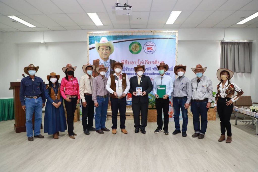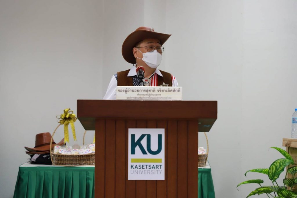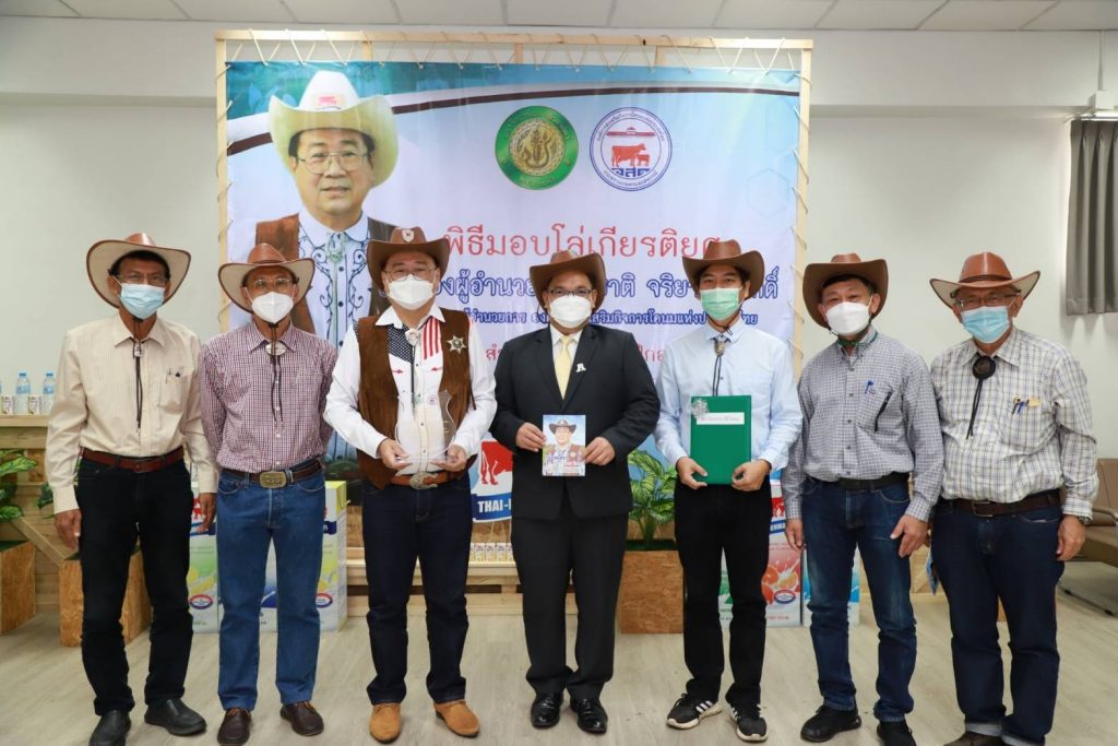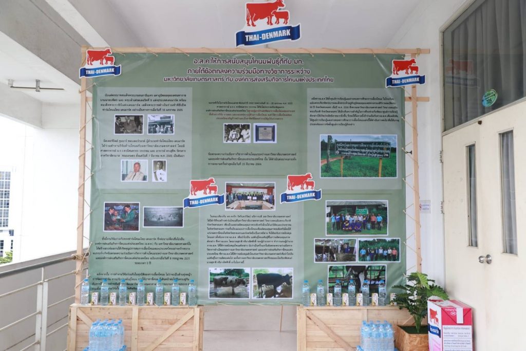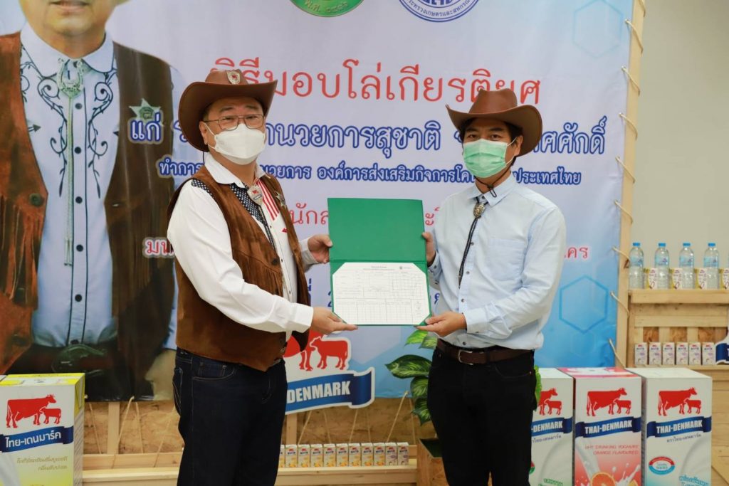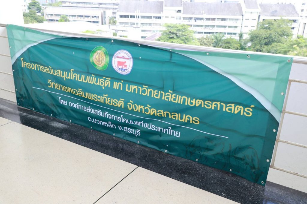 วันที่ 27 กันยายน 2564 นายสุชาติ จริยาเลิศศักดิ์ รองผู้อำนวยการ ทำการแทนผู้อำนวยการองค์การส่งเสริมกิจการโคนมแห่งประเทศไทย (อ.ส.ค.) เข้ารับมอบโล่เกียรติยศ จาก ดร.จงรัก วัชรินทร์รัตน์ อธิการบดีมหาวิทยาลัยเกษตรศาสตร์ ภายใต้ข้อตกลงความร่วมมือทางวิชาการระหว่างมหาวิทยาลัยเกษตรศาสตร์ กับองค์การส่งเสริมกิจการโคนมแห่งประเทศไทย (อ.ส.ค.) ซึ่งได้สร้างสรรค์ผลงานให้เกิดคุณูปการต่อการเลี้ยงโคนมของประเทศไทยอย่างกว้างขวางเป็นอันดีเสมอมาตั้งแต่ปี 2531 จนถึงปัจจุบัน และในการนี้นายสุชาติ จริยาเลิศศักดิ์ รองผู้อำนวยการ ทำการแทนผู้อำนวยการ อ.ส.ค.ได้ให้เกียรติมอบทะเบียนประวัติโคนม ที่ทาง อ.ส.ค.ได้มอบโคท้องสาว 2 ตัว และขายราคาพิเศษ อีก 3 ตัว ราคา 1 แสนบาท ให้กับ มหาวิทยาลัยเกษตรศาสตร์ วิทยาเขตเฉลิมพระเกียรติ จังหวัดสกลนคร ในโครงการสนับสนุนโคนมพันธุ์ดี ให้แก่ฟาร์มโคนม โดยมี ผศ.ดร.ศุภสิทธิ์ สิทธาพานิช คณบดีคณะทรัพยากรธรรมชาติและอุตสาหกรรมเกษตร สกลนคร เป็นผู้รับมอบ พร้อมมอบกระเช้าผลิตภัณฑ์นมไทย-เดนมาร์ค มอบเป็นของที่ระลึก ซึ่งภายในงานมี ผศ.ดร. นิคม แหลมสัก รองอธิการบดีฝ่ายนวัตกรรมและกิจการเพื่อสังคม รศ.ดร. สมเกียรติ ประสานพานิช ภาควิชาสัตวบาล คณะเกษตร มหาวิทยาลัยเกษตรศาสตร์ ผู้บริหารและพนักงาน อ.ส.ค.เข้าร่วมแสดงความยินดี ณ สำนักส่งเสริมและฝึกอบรม มหาวิทยาลัยเกษตรศาสตร์ บางเขน กรุงเทพฯ