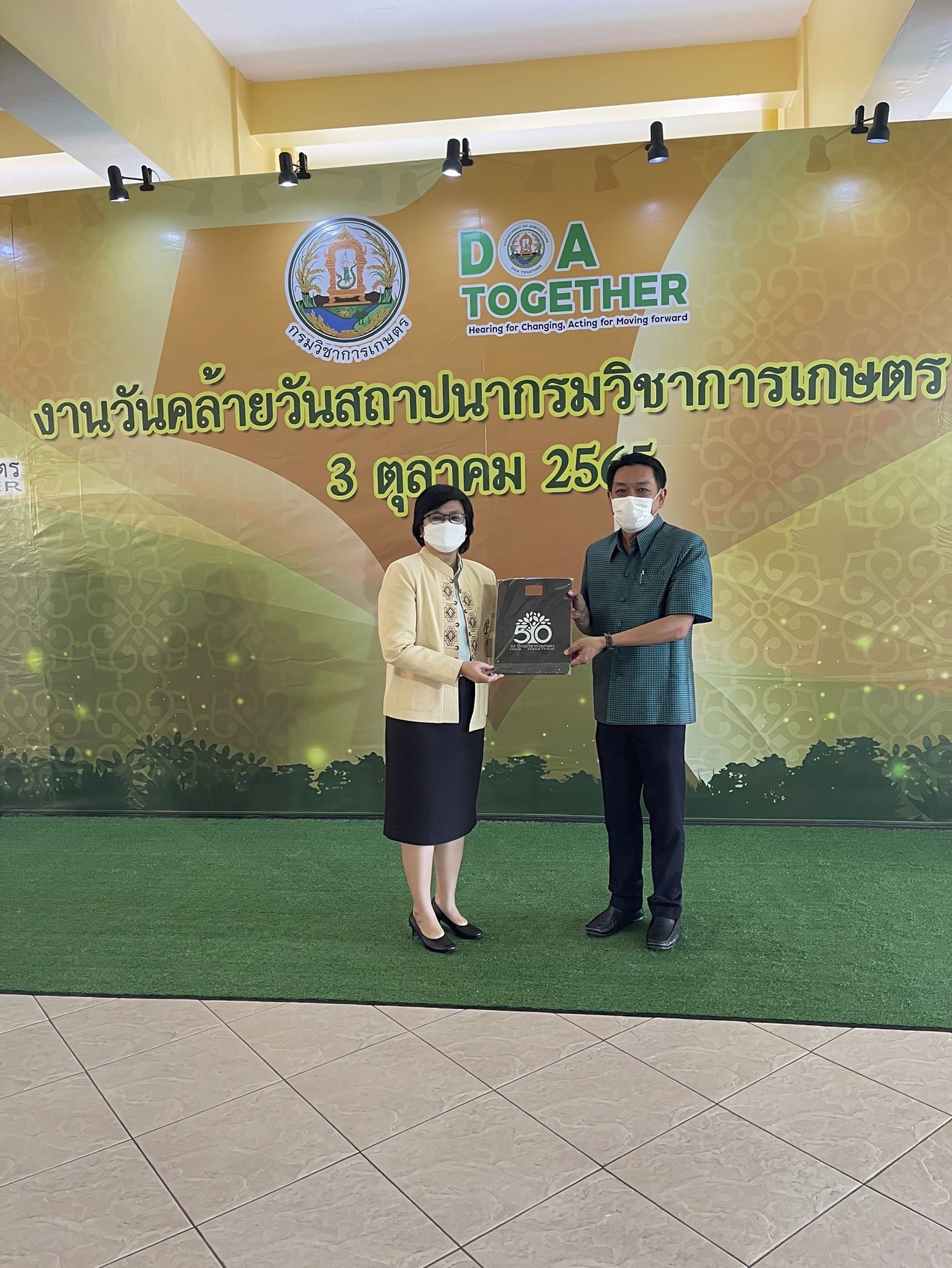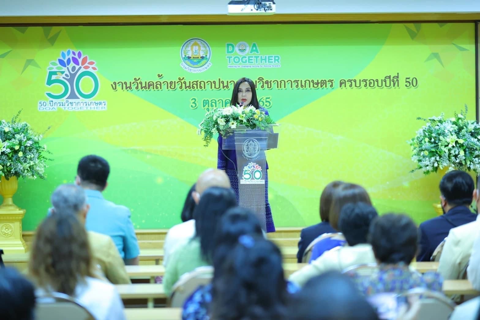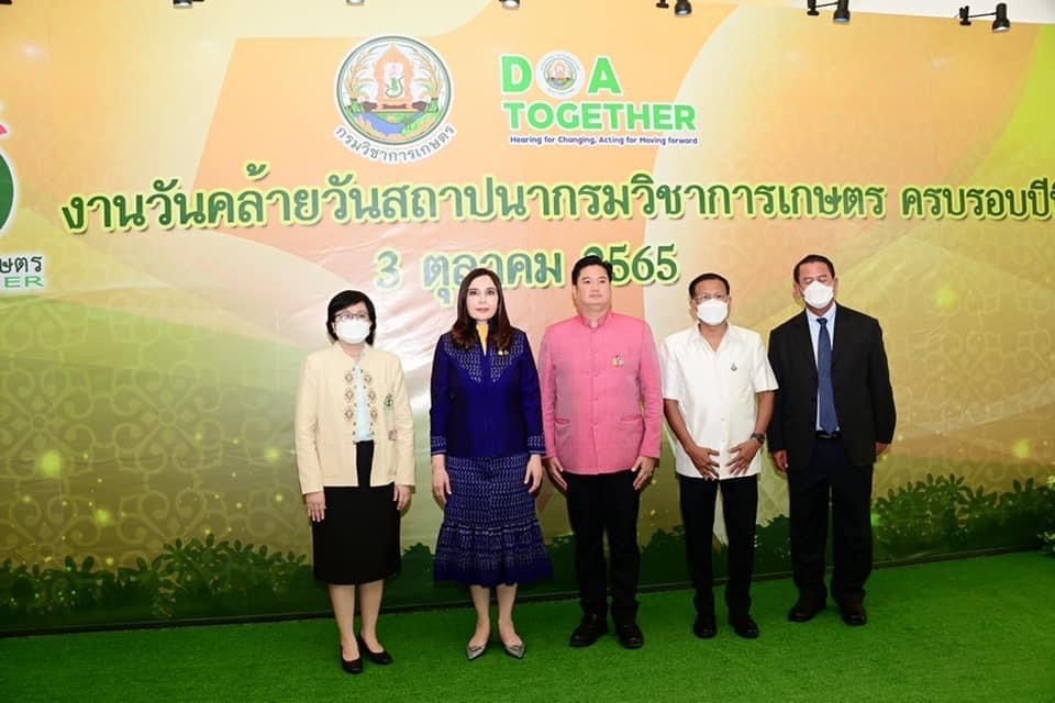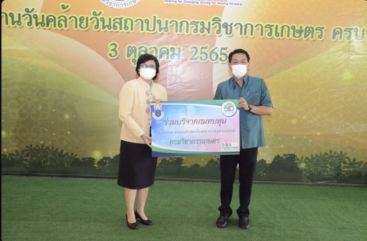 วันที่ 3 ตุลาคม 2565 รมช.มนัญญา ไทยเศรษฐ์ รัฐมนตรีช่วยว่าการกระทรวงเกษตรและสหกรณ์ ให้เกียรติเป็นประธานพิธีอ่านสารแสดงความยินดี เนื่องในโอกาสวันสถาปนากรมวิชาการเกษตร ครบรอบ 50 ปี โดยมี นายระพีภัทร์ จันทรศรีวงษ์ อธิบดีกรมวิชาการเกษตร พร้อมด้วยผู้บริหารระดับสูง ข้าราชการส่วนงานต่างๆ เข้าร่วมในงานแสดงความยินดีในครั้งนี้ด้วย จากนั้น รมช.มนัญญา ไทยเศรษฐ์ ได้เดินเยี่ยมชมนิทรรศการแสดงผลงานวิจัยและเทคโนโลยีของกรมวิชาการเกษตร โดย นายสมพร ศรีเมือง ผู้อำนวยการ อ.ส.ค. มอบหมายให้ นายชัยณรงค์ เปาอินทร์ รองผู้อำนวยการ อ.ส.ค. ร่วมต้อนรับและแสดงความยินดีในงานนี้ พร้อมทั้งมอบเงินบริจาคเพื่อสมทบทุนมูลนิธิคณะแพทยศาสตร์ จุฬาลงกรณ์มหาวิทยาลัย เนื่องในโอกาสวันคล้ายวันสถาปนากรมวิชาการเกษตร ครบรอบ 50 ปี ทั้งนี้ทุกท่านได้ปฏิบัติตามมาตรการป้องกันการแพร่ระบาดของโรคติดเชื้อโควิด-19 อย่างเคร่งครัด ณ กรมวิชาการเกษตร บางเขน กรุงเทพฯ