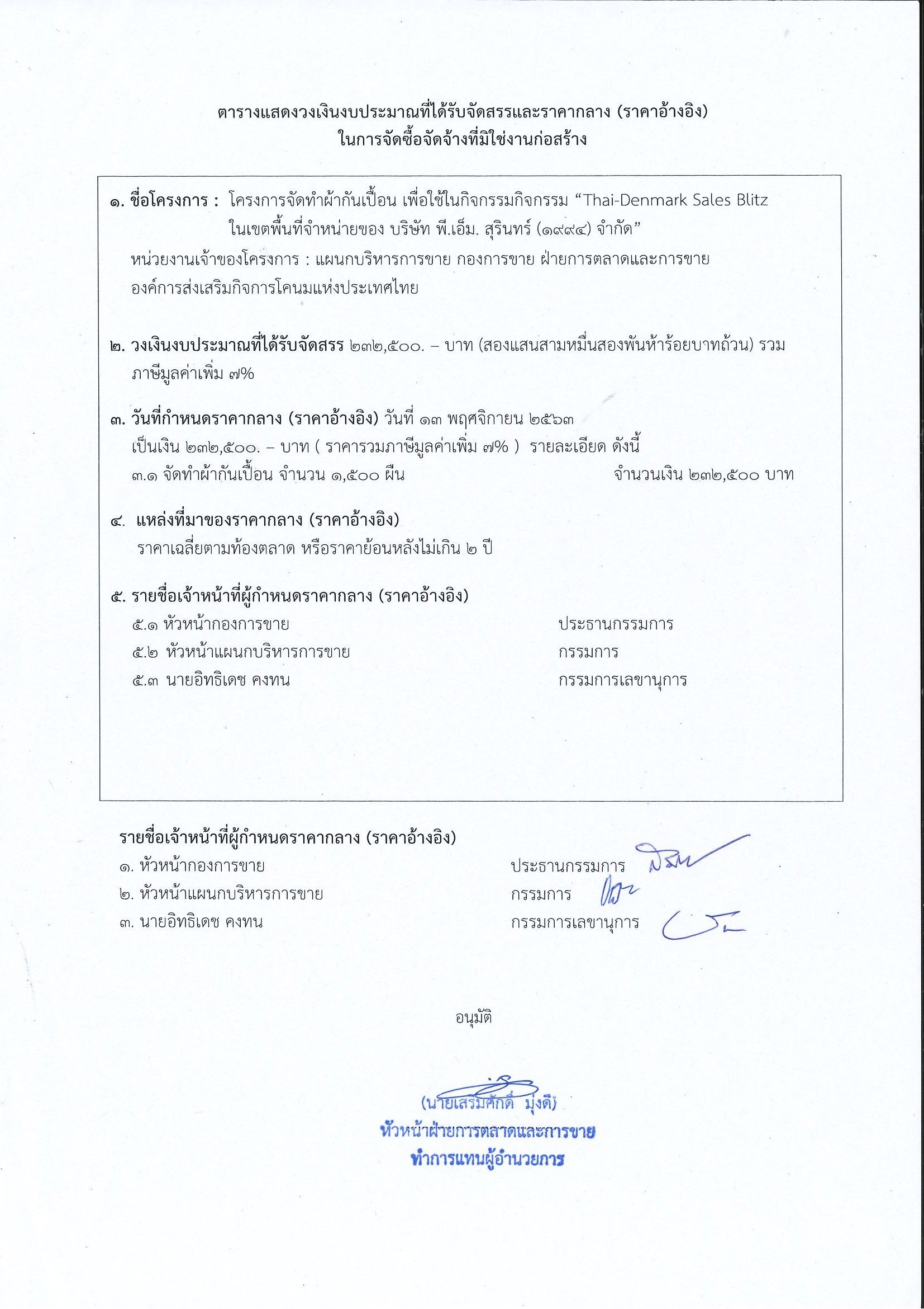 Homeประกาศจัดซื้อ จัดจ้างโครงการจัดทำผ้ากันเปื้อน เพื่อใช้ในกิจกรรม "Thai-Denmark Sales Blitz ในเขตพื้นที่การจำหน่ายของ บริษัท พี.เอ็ม. สุรินทร์ (1994) จำกัด"